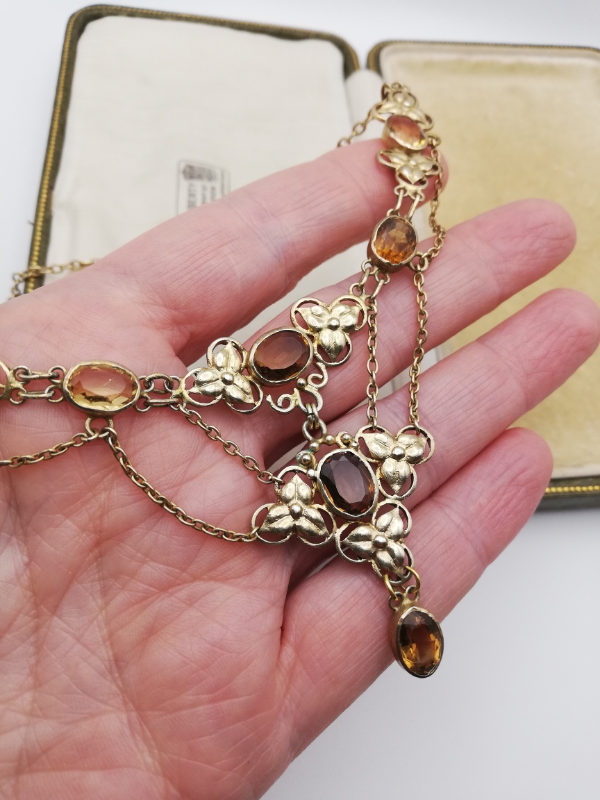 Antique Arts and Crafts festoon necklace in silver gilt with citrines