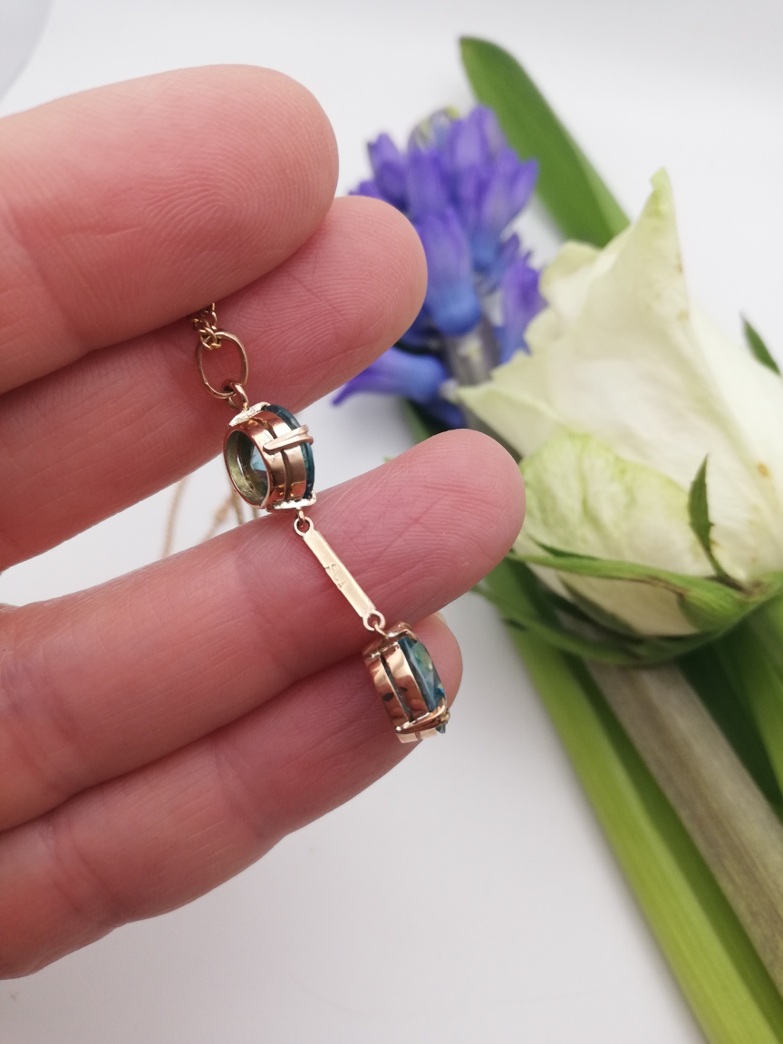 I am including a more modern 9ct gold trace chain with the pendant so that it is ready to be worn or else gifted to a lucky recipient. Conveniently the chain has a gold safety chain with it too, so that it offers you that extra security when wearing the piece. In pleasing condition with only light wear to the stones; the top stone measures approx 8mm in diameter and the bottom stone measures approx 9mm in diameter. The chain is 42.5cm (16.75 inches) in length. The pendant drop is approx 4.4cm.