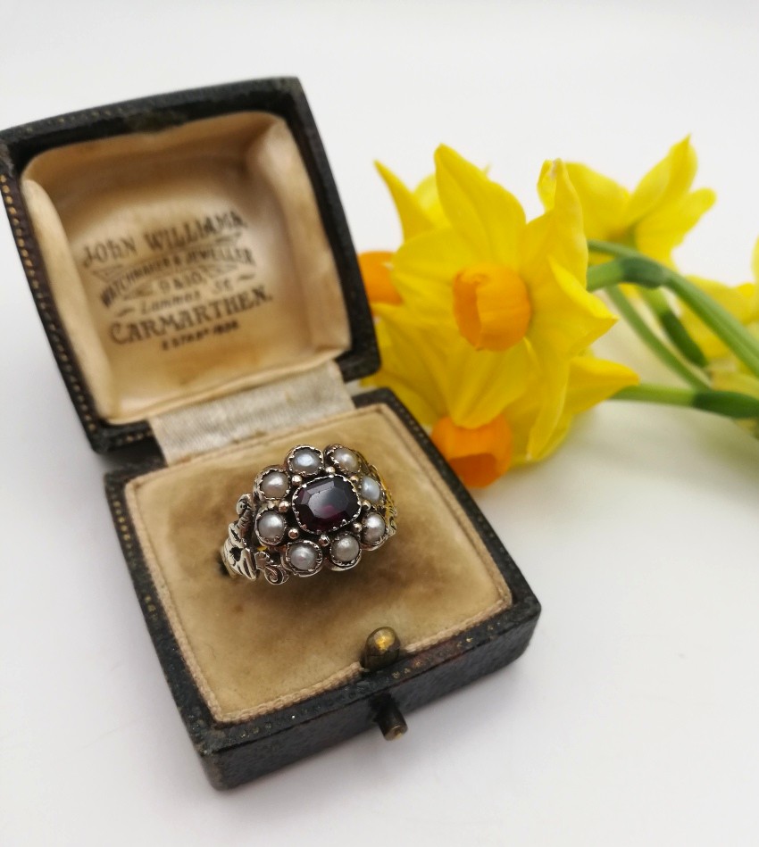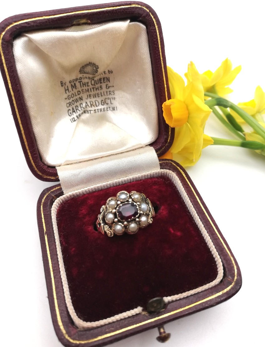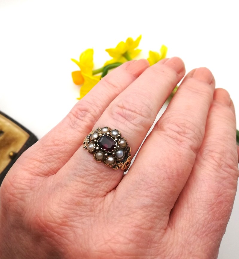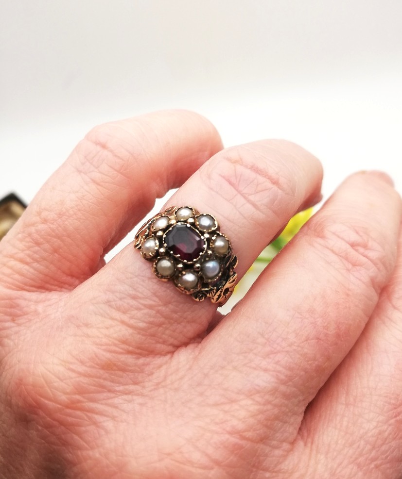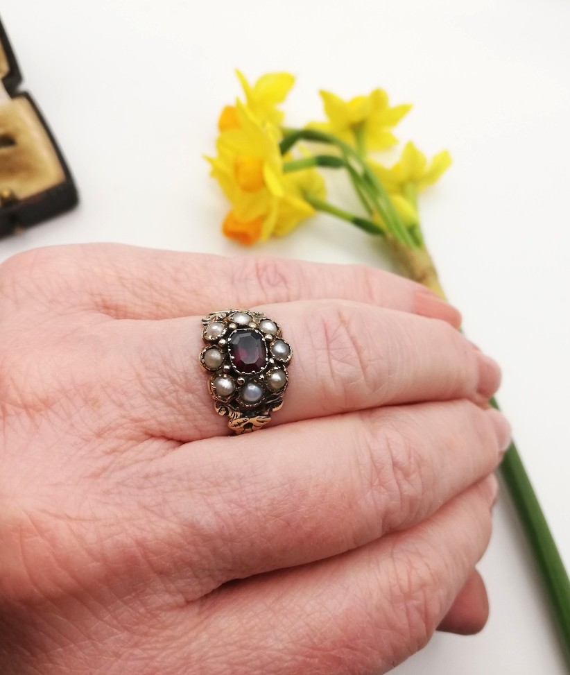 Antique Georgian 15ct gold flower ring with garnet pearls and decorated band