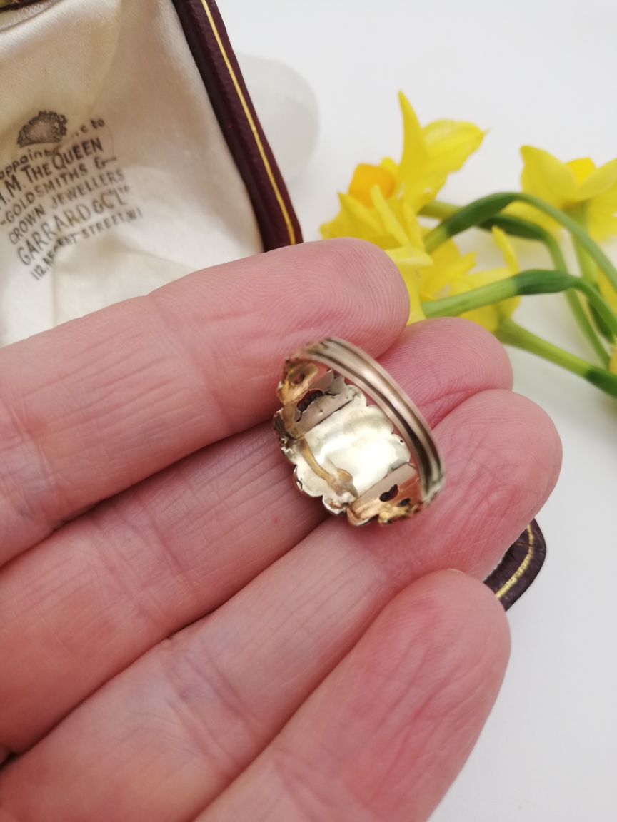 It is an attractive, eye-catching that looks lovely on the finger, as I hope you can see. It is well rounded in shape on the inside and is so comfortable to wear because of this. The face of the ring measures approx 1.2cm in height by approx 1.5cm. It measures as an approx UK size L (US approx 5.75). It weighs approx 2.5g. In pleasing condition, one of the tiny seed pearls may be a replacement but has been particularly well done. Each pearl is organically a different hue to the next, as nature intended.