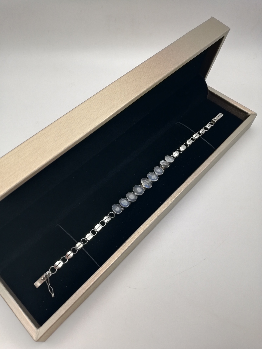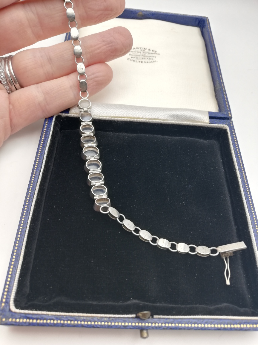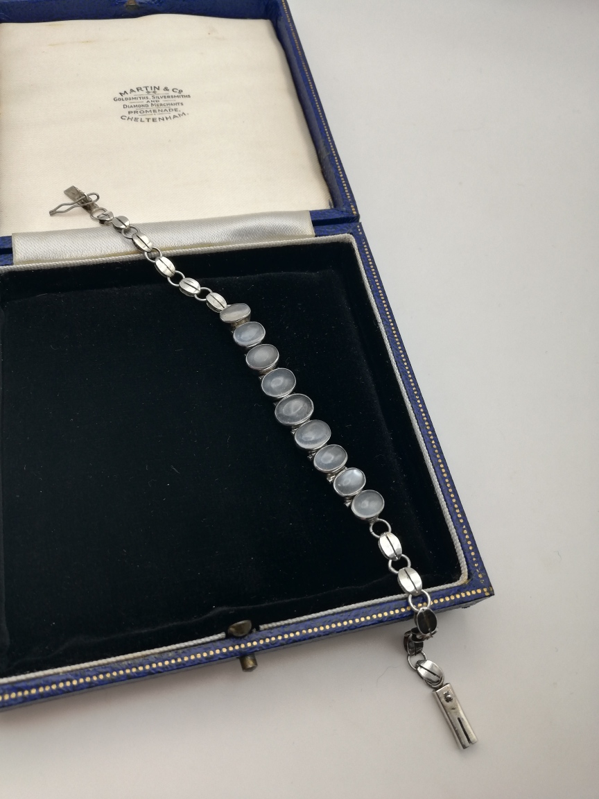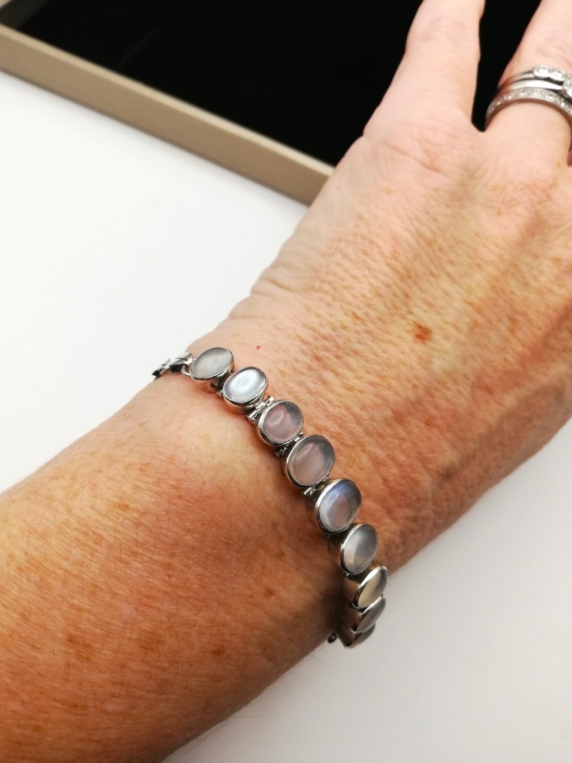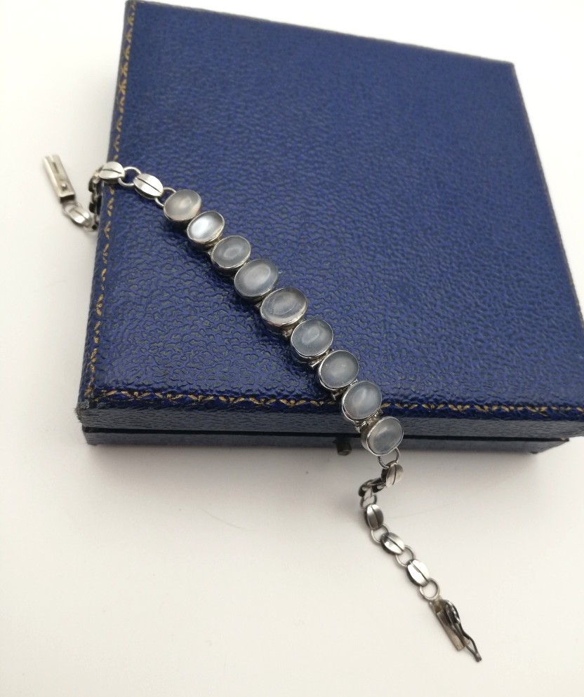 A lovely Art Deco sterling silver bracelet with 9 bezel-set moonstones. Great to have bezel-set as this gives a smooth feel to the stones’ section without the snagging you can sometimes get with claw versions of this bracelet. I love the domed and liquid quality of these stones, which have a pale blue base with the off flash of adularescence here and there. The stones and their settings are all hinged to the next which gives a robust yet sinuous quality to the bracelet as you wear it.