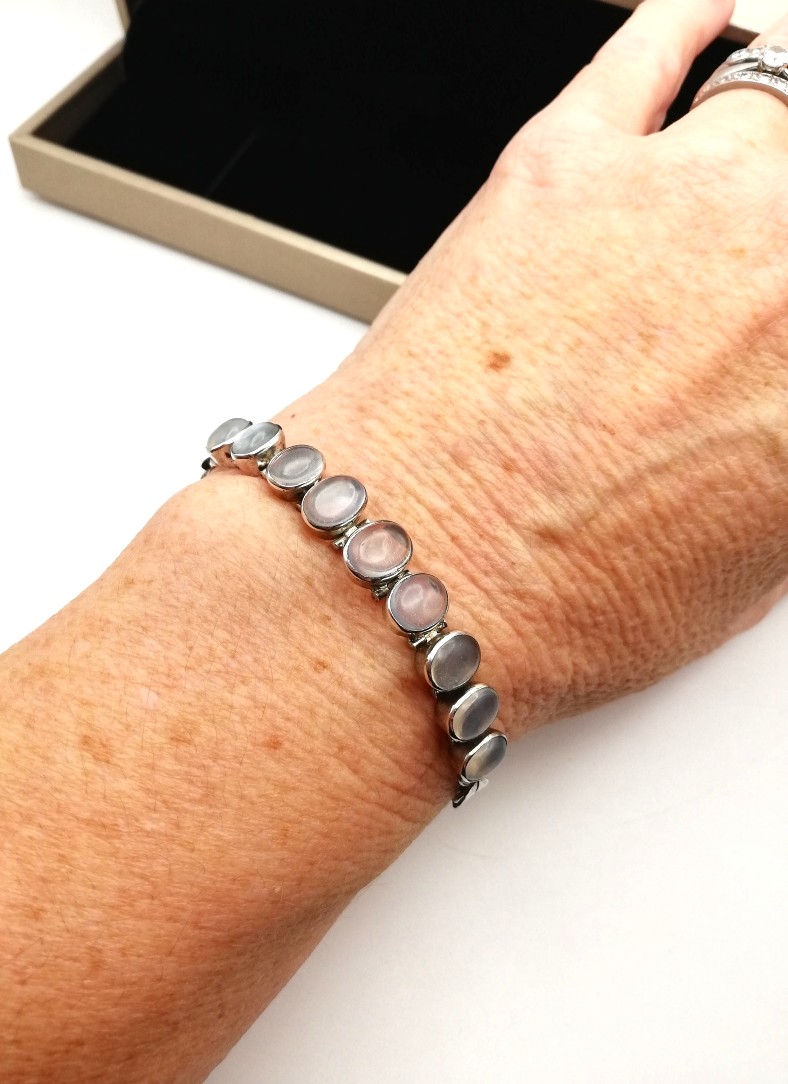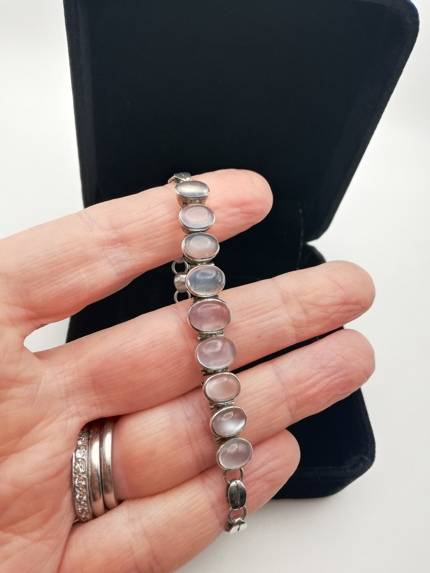 I love the slightly graduated nature of the bracelet too, with the largest stone in the centre. No markings, as is typical for these bracelets, but it tests as sterling silver. It polishes beautifully to a high shine. The width of the bracelet is approx 9mm and the length is approx 18cm ( approx 7.25 inches). It is such a wearable size for day or evening use and you could of course, stack with other moonstone bracelets. I am also selling a large double row bracelet separately.