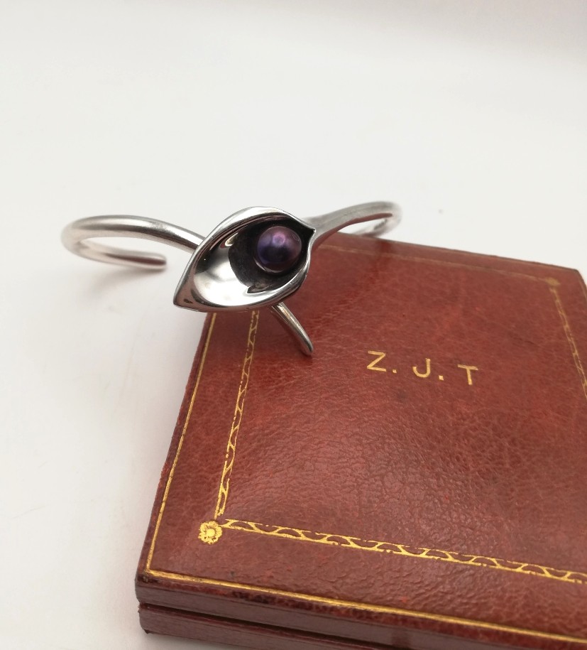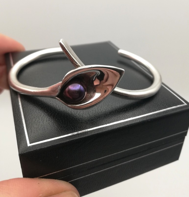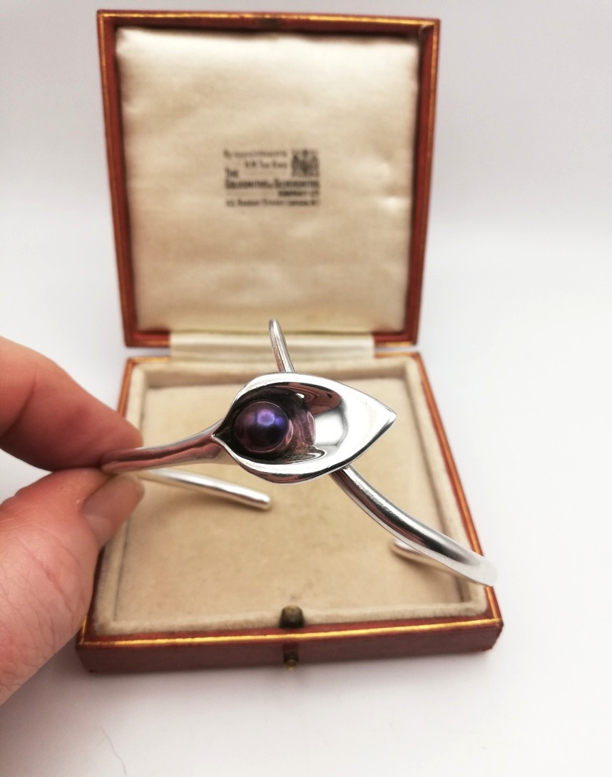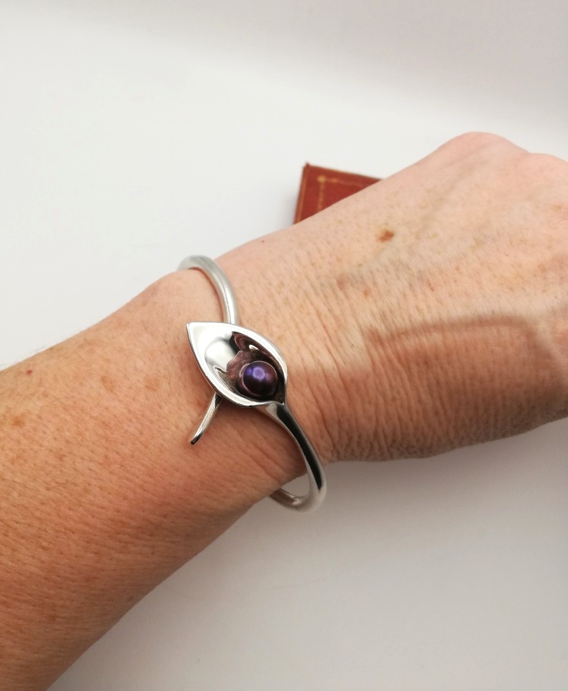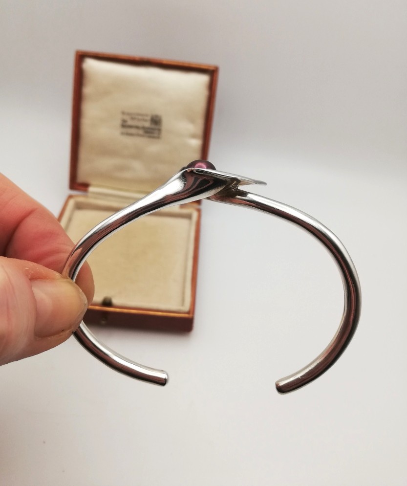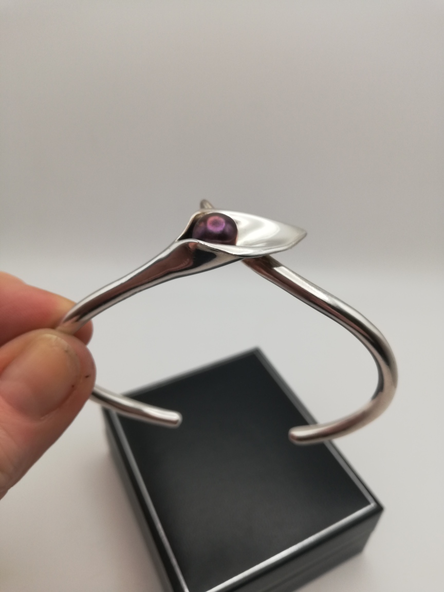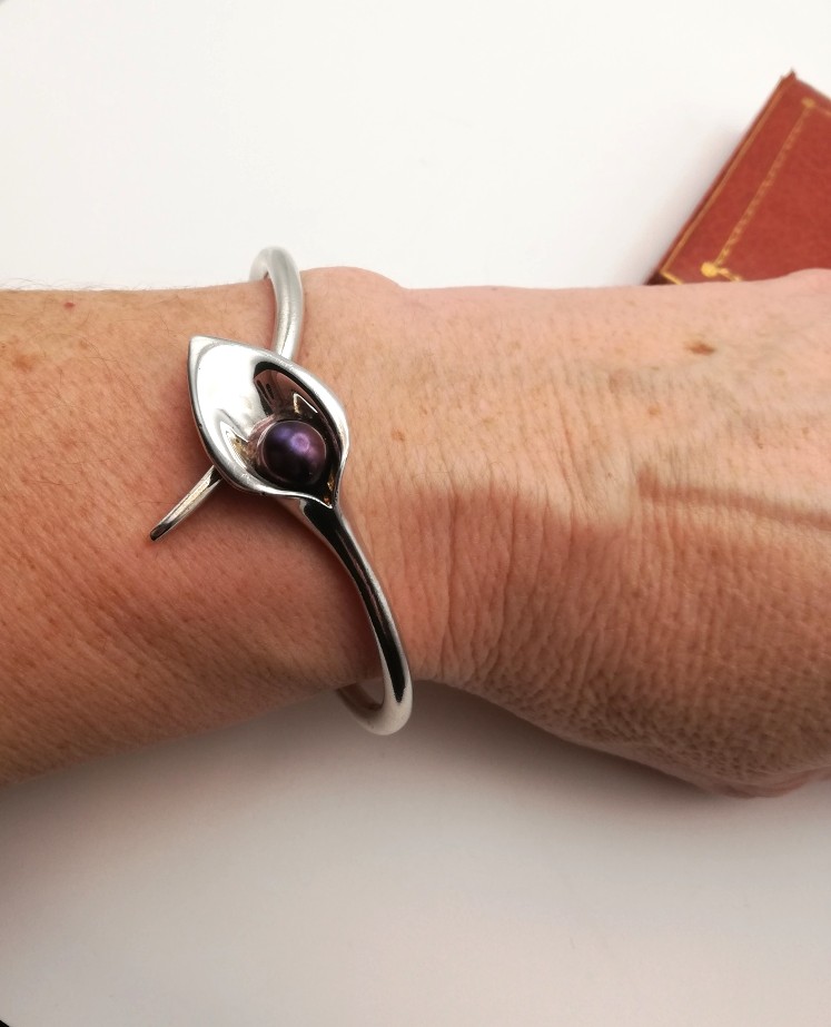 A superbly organic and naturalistic solid silver bangle, in the form of a calla lily set with a purple/grey pearl-like detail. The bangle is a substantial weight at 25g and consists of two solid stalk-like elements, which overlap at the flower detail. The UK hallmarks are for Birmingham 2007.