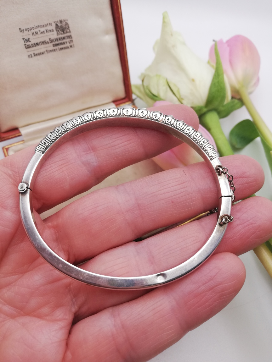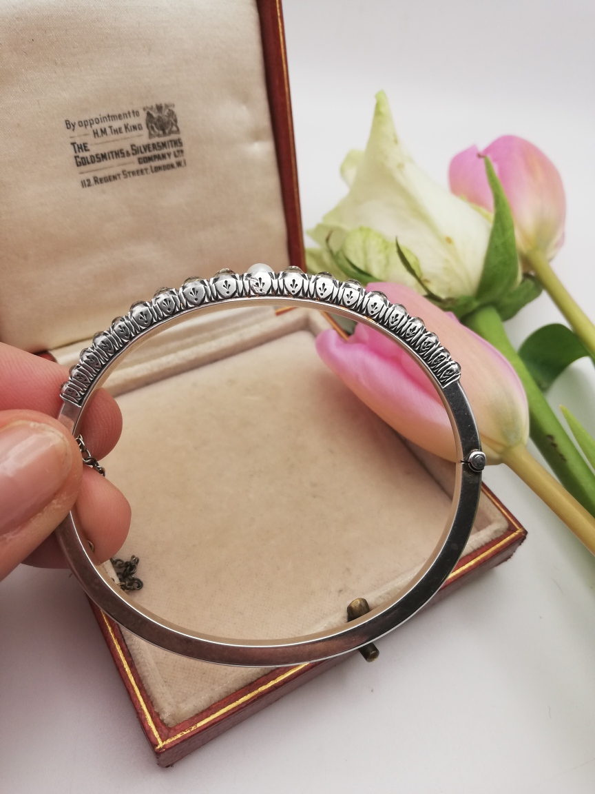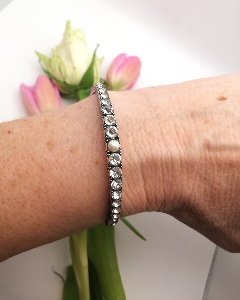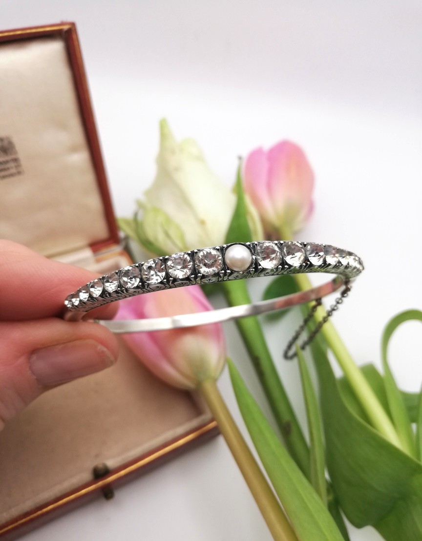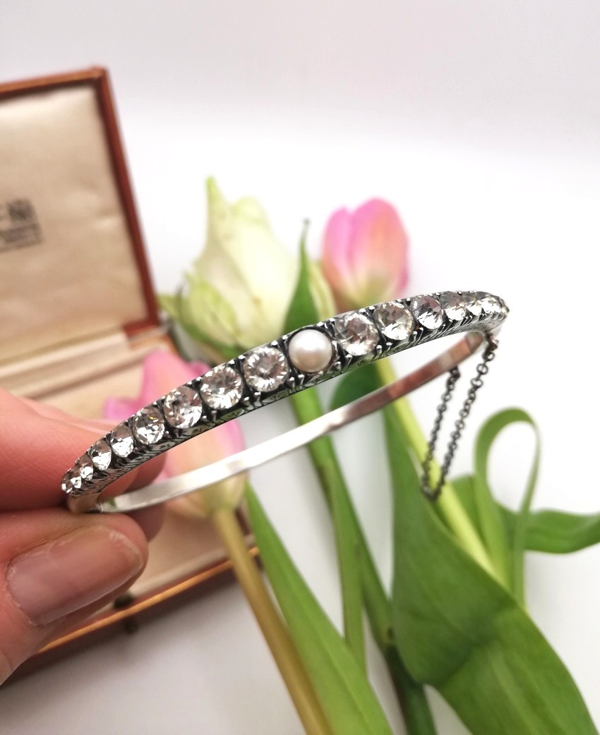 A beautiful antique bangle with the diamond pastes remaining being bright and twinkly. Crafted in the late Victorian era, this is a lovely example of its type, with those intricate engraved designs on either side of the stones’ section (sterling silver). I also love the central cultured pearl rather than it being a straight line of diamond pastes. It just looks a little more special because of this.