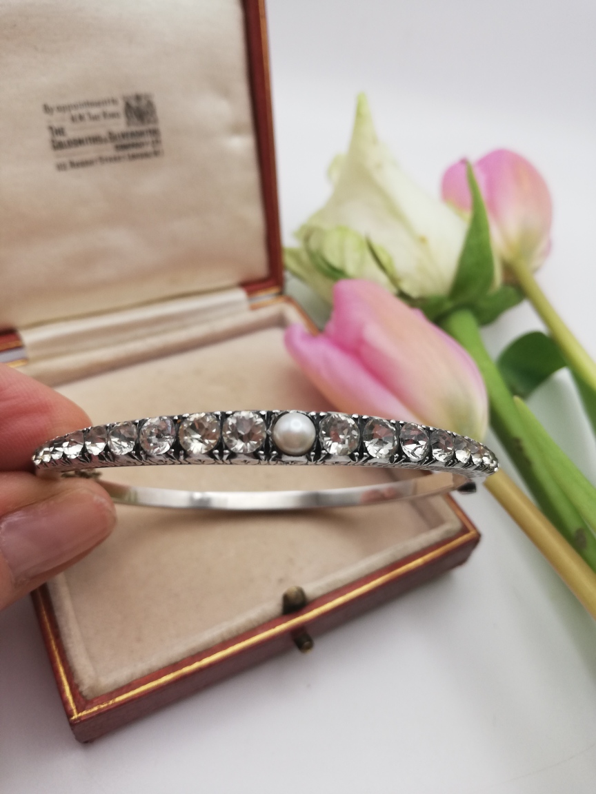 A lovely design from the Victorian era with a nod to the coming belle Epoque sensibilities with its use of diamond pastes and pearl. Inside bangle measurement is approx 17cm.