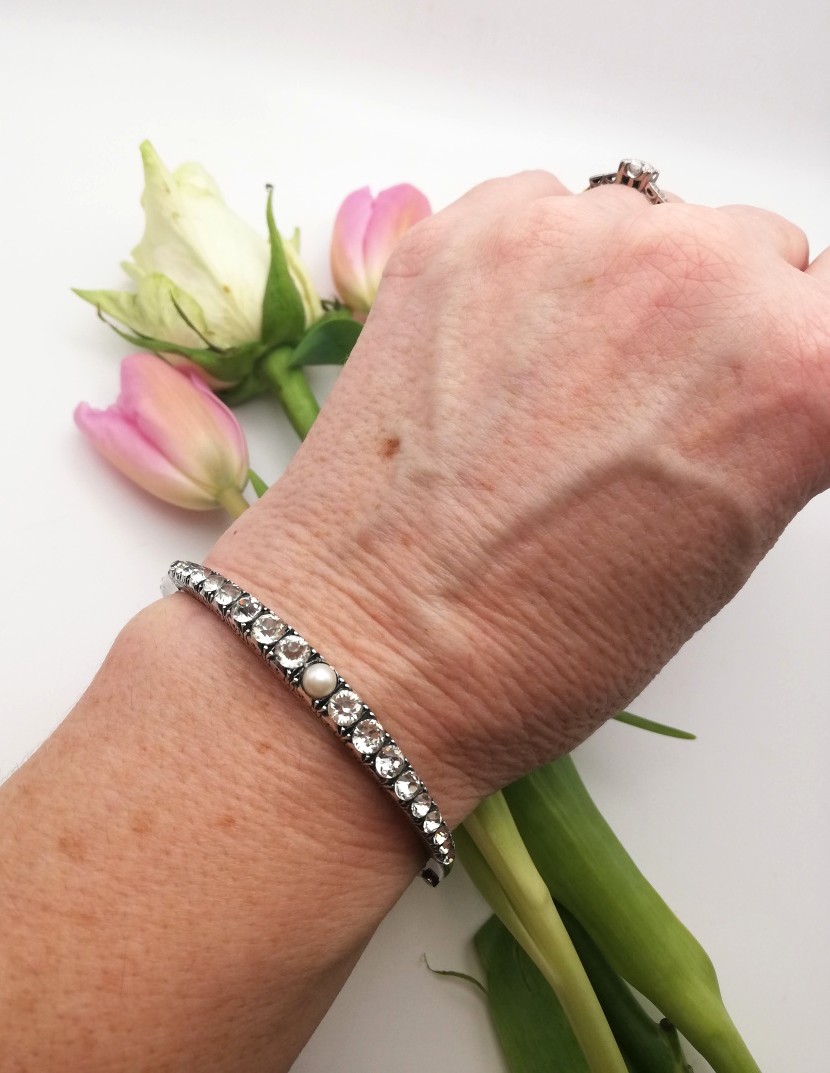 Attractive Victorian silver cultured pearl and diamond paste bangle