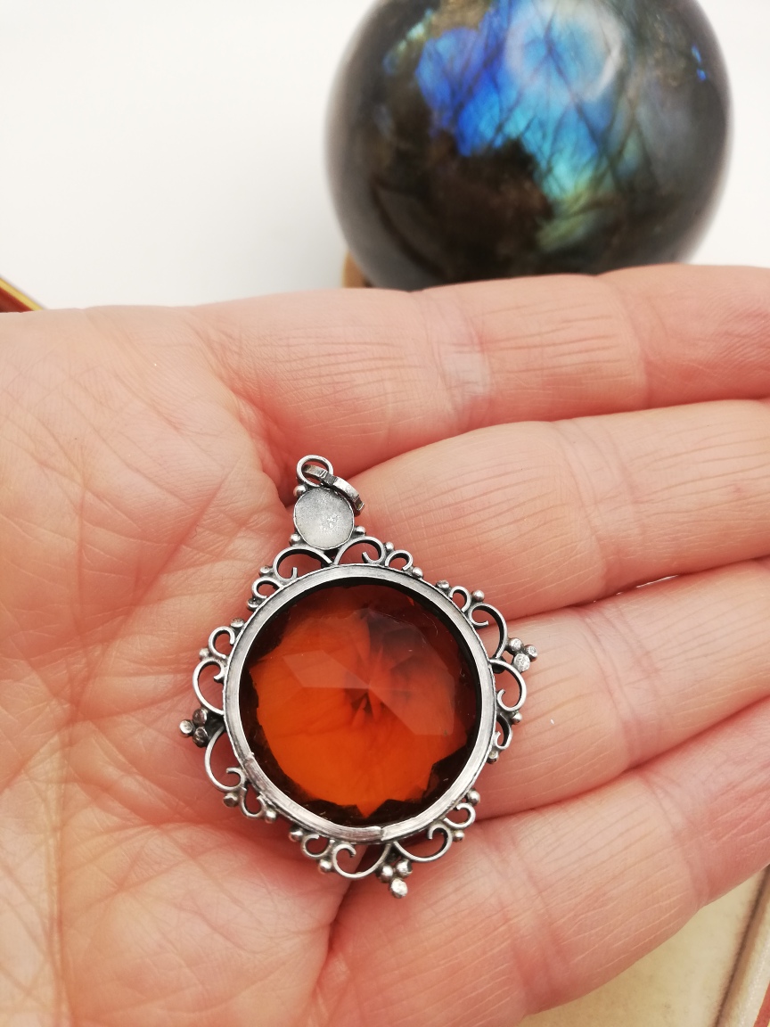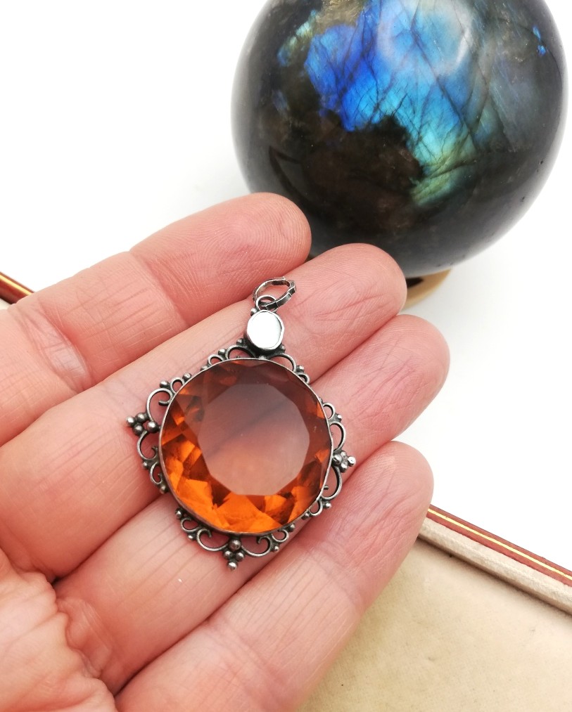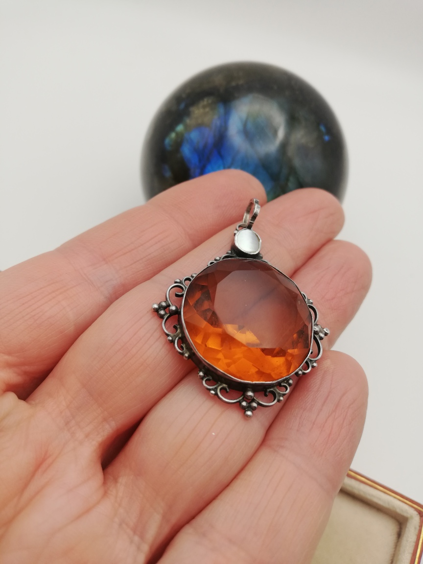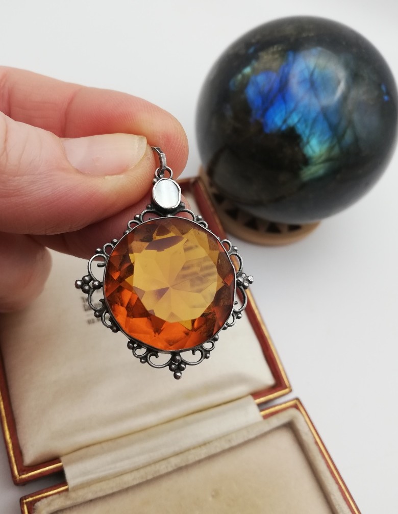 This is an eye-catching antique English c1900 Arts and Crafts sterling silver pendant with a particularly striking topaz paste stone. It has been wonderfully-cut and I love how it catches the light easily. The colour is the exact intense orange you have with topaz stones….so remarkably vivid. I also adore how there is a small bezel-set mother-of-pearl set above it, as the colours look clean and fresh together.