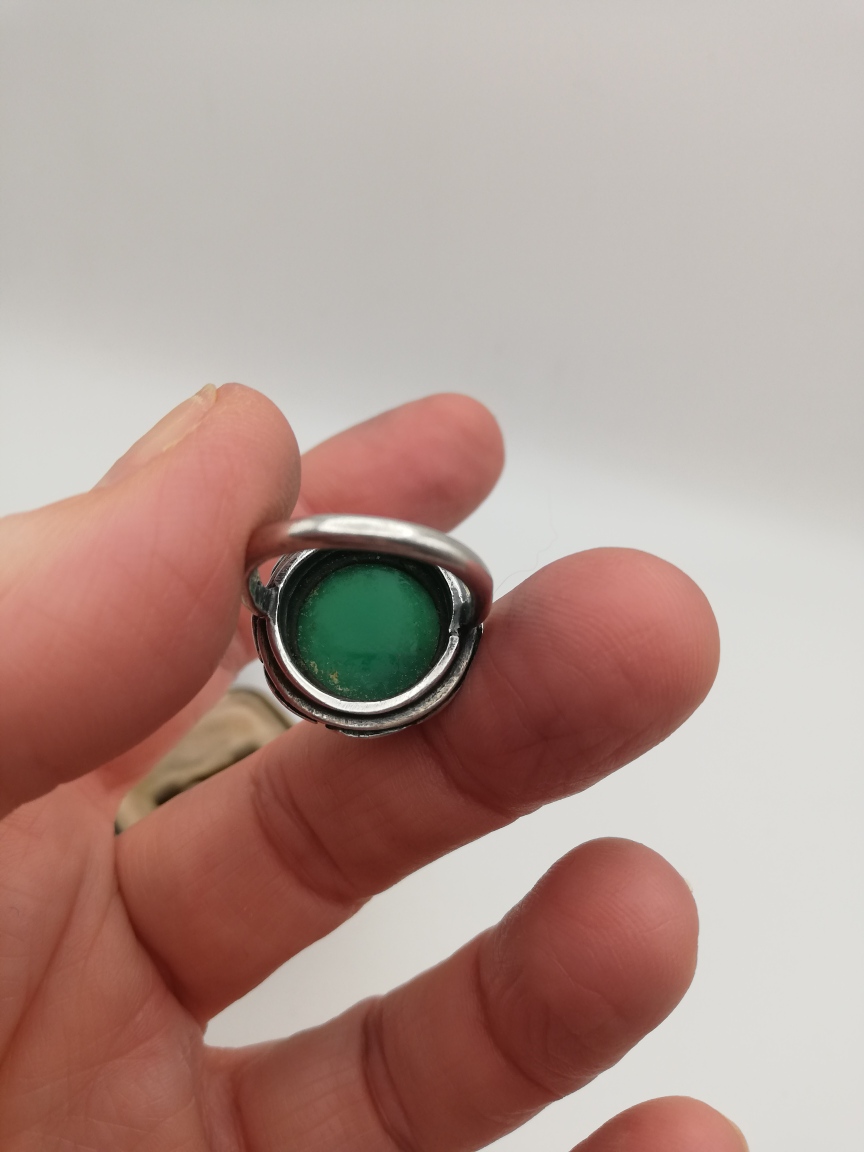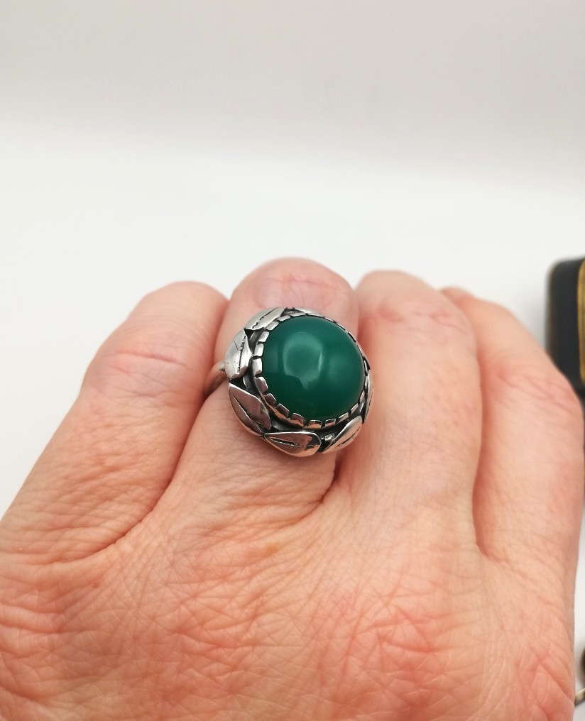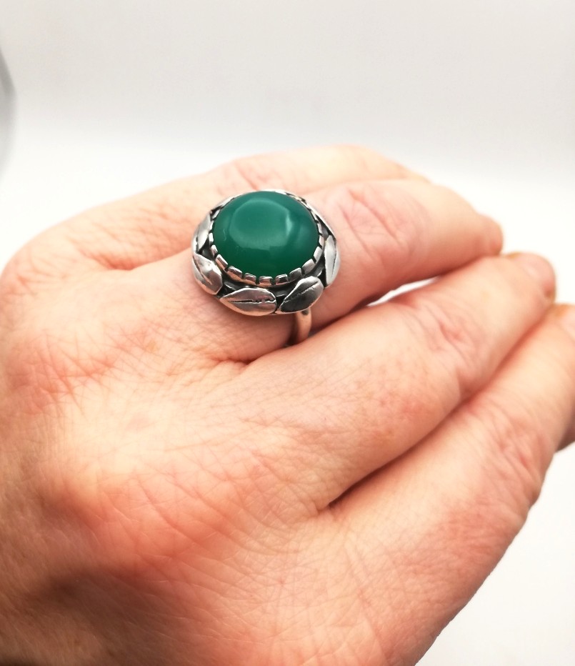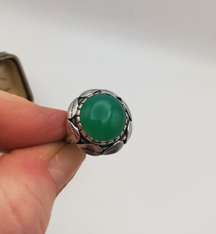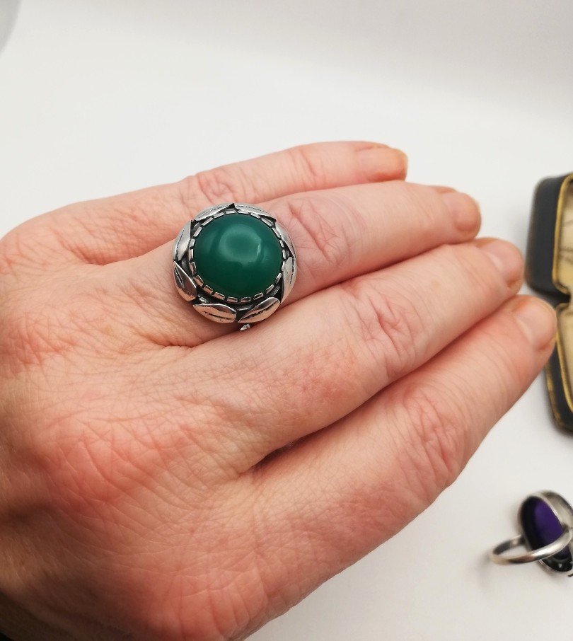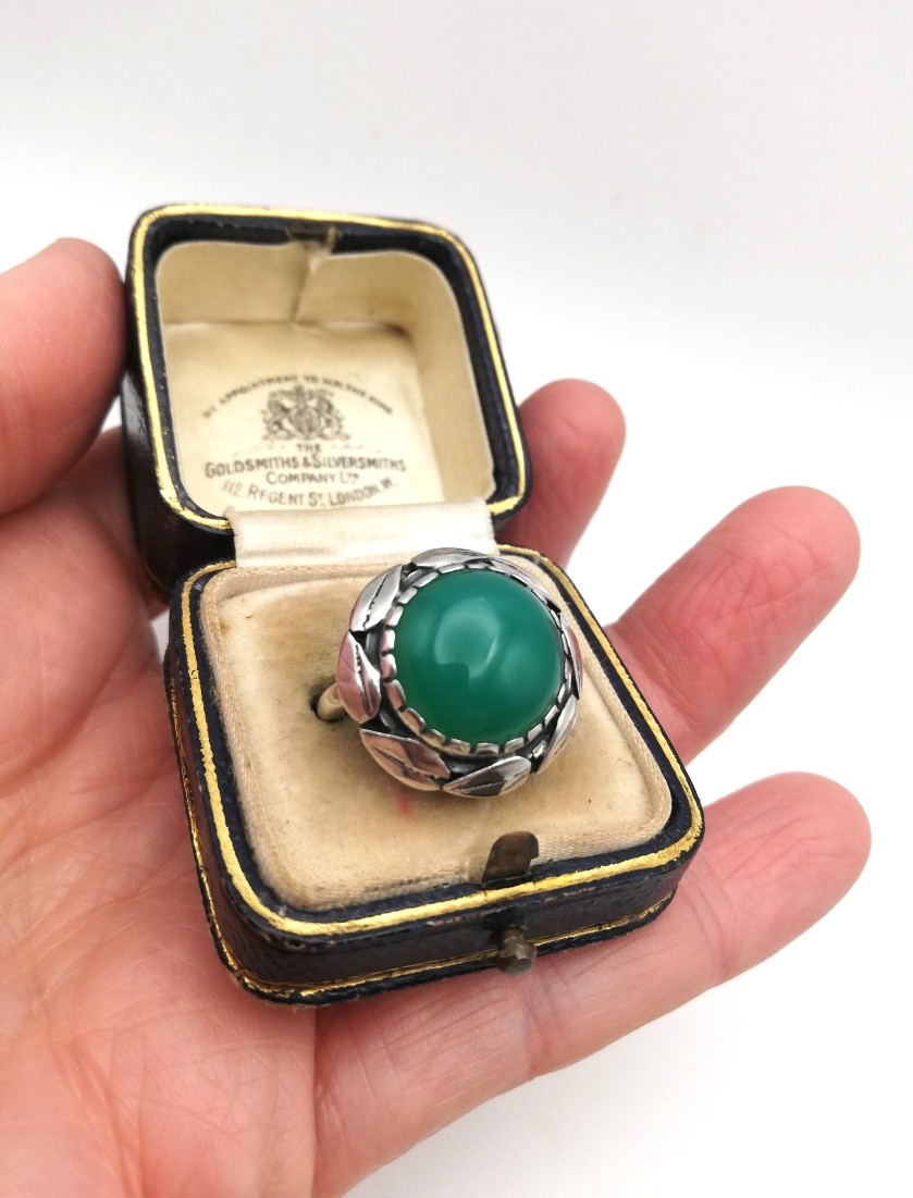 It is such a harmonious and balanced piece, being circular with that well-placed halo of leaves running around the circumference of the face of the ring. I always love to see chrysoprase (stained agate) set against silver in these delightful Arts and Crafts pieces. A very lovely combination. The ring sits well on the finger and is gently mounded so that it does not present edges for snagging and so on. A lovely wide silver band adds further comfort and stability to the ring.