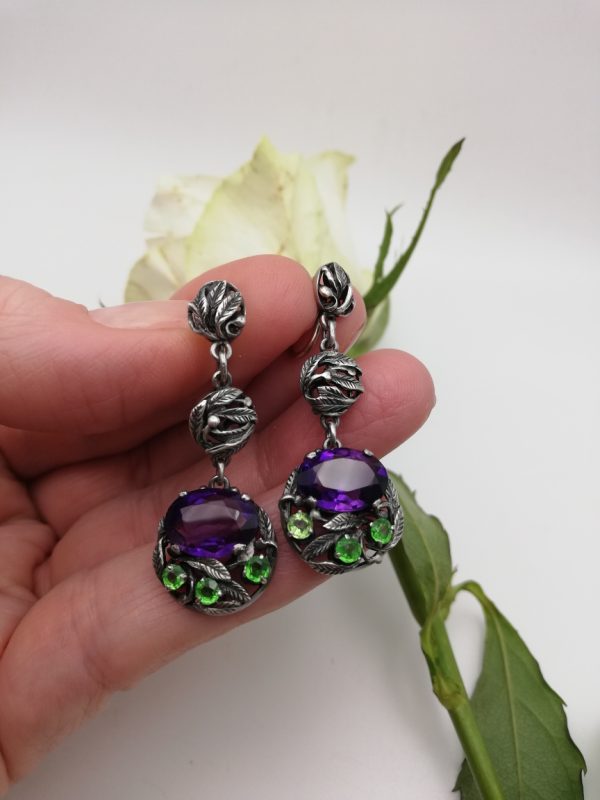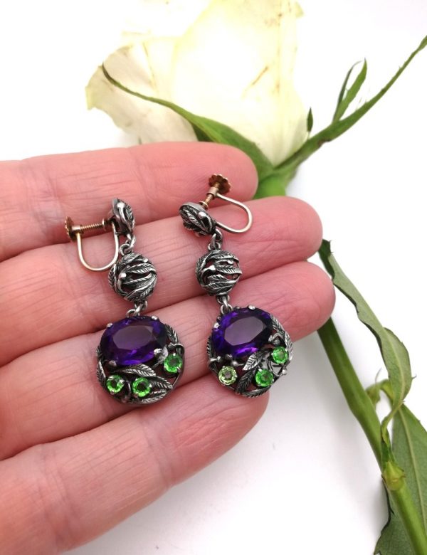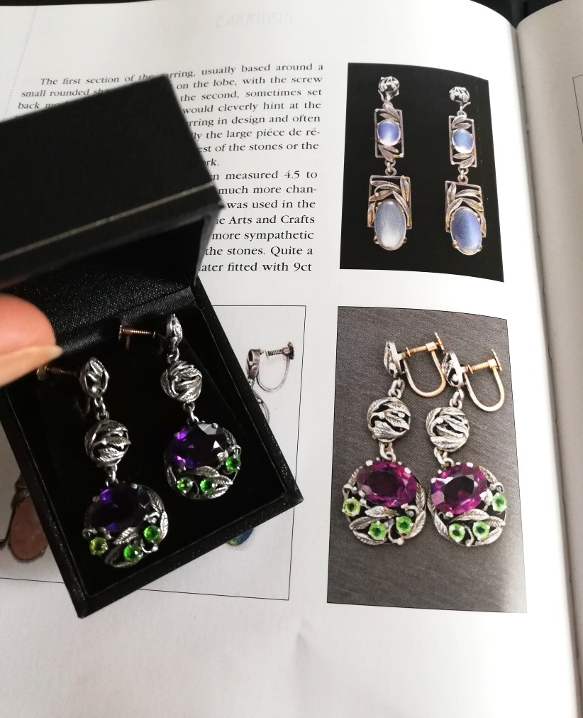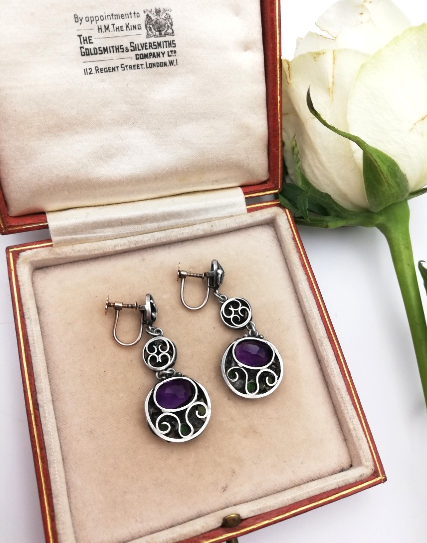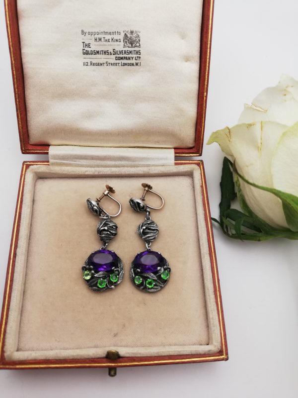 What a wonderful example of Bernard’s early 1925 to 1930 Arts and Crafts earrings. Structured in three articulated sections, each having those fine hand-tooled Instone leaves and tendrils, with the main circular section set with a Cadbury’s Royal purple Siberian amethyst and contrasting green pastes A truly vibrant, statement pair of earrings! They are featured in literature too, on page 162 of “Bernard Instone Designer and Craftsman; the art of a jeweller” by Tracy Henriksen.