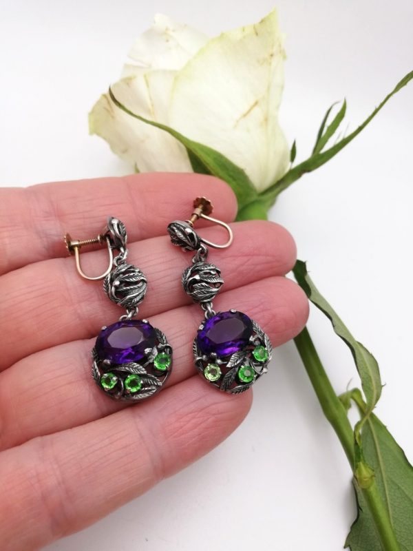 The use of those complementary-coloured stones is sublime, with Bernard matching those startlingly vivid Siberian amethysts with just the perfect shade of green pastes. The result is a wonderfully bright floral display that is oh so attractive. The earrings have beautifully tidy versos as you would expect from Bernard’s designs and they are fitted with the original 9ct gold screw back fittings.