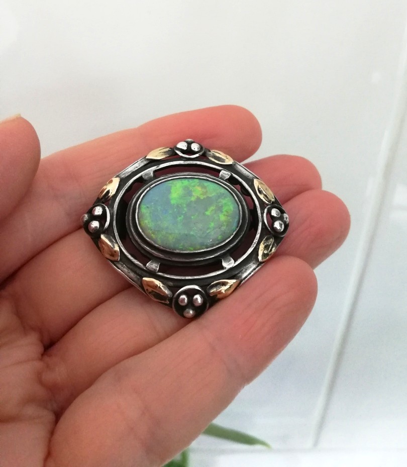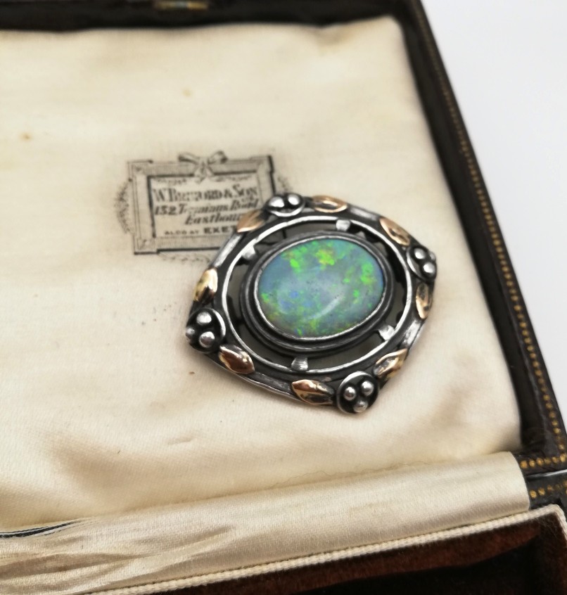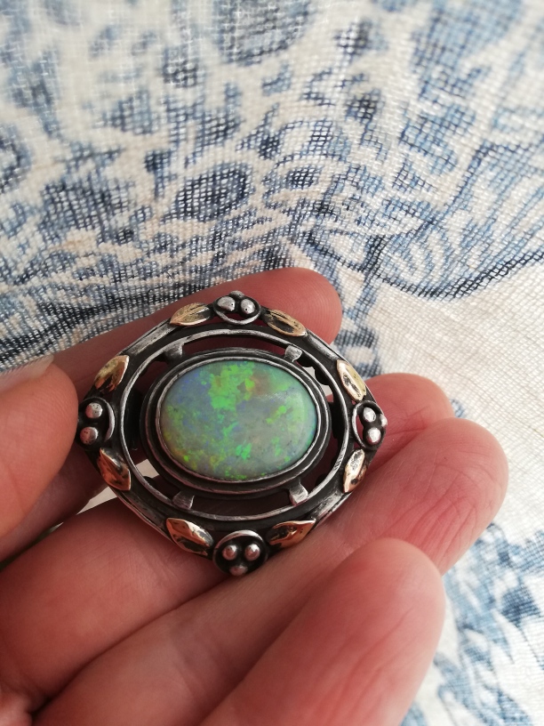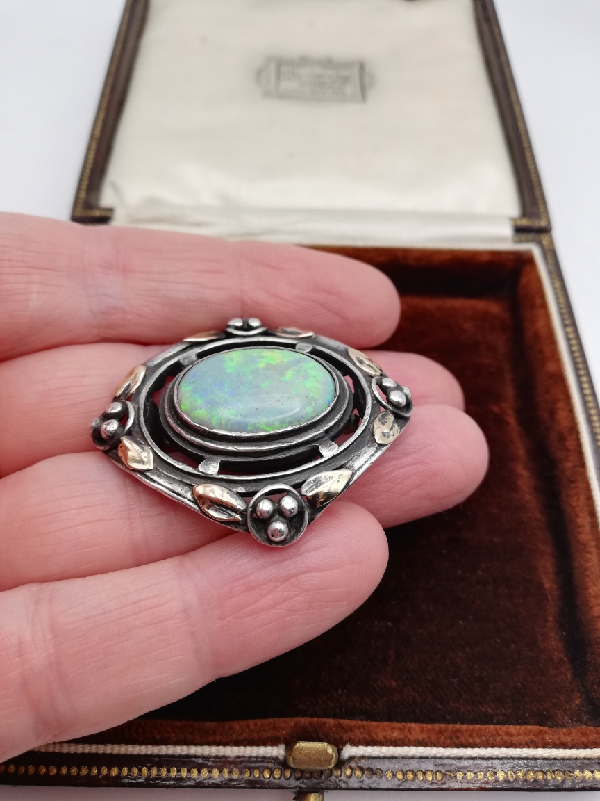 An exceptional find-a c1900 English Arts and Crafts brooch with a large and hugely lively opal. For me, it is most likely an opal from Lightning Ridge in Australia. I actually don’t think I have come across such a large opal in an English Arts and Crafts brooch before. (It measures approx 2cm by 1.5cm) The brooch is definitely c1900-1905 and I have seen the work of this maker twice before, in items I have sold over the years. It is probably by a Birmingham silversmith who made a small range of “Dawn Reg’d” Arts and Crafts items for Liberty & Co of London. The leaves on this brooch are identical on the two other examples I have seen, however, on this wonderful brooch they are highlighted in gold.