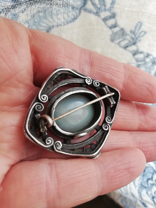 The opal is highly colourful, with vibrant lime greens, turquoise and purples. I adore the fact that the opal is bezel-set and has several ovals of silver acting as a halo to it. The stylised gold leaves flank a flower detail which is very distinctive. A little circle, containing three silver balls. Very typical of the Birmingham School jewellers. Flip the brooch over and look at the verso, you will see a very distinctive silver framework, consisting of four arched silver wires, each ending in a spiral of silver. This feature sings the design style of William Thomas Blackband, however, I just don’t have enough concrete details to assign a definite designer attribution.