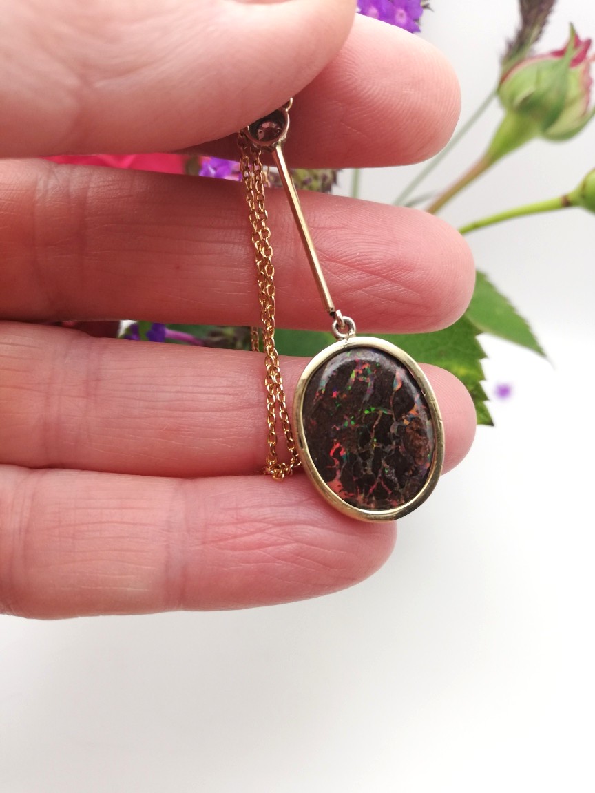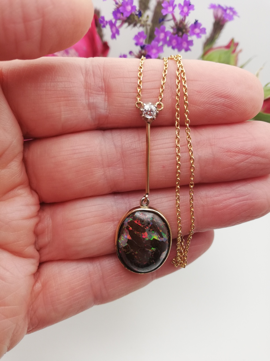 A sleek and elegant piece of jewellery, screaming unhindered quality at you. The old-cut diamond is set at the joining of the two sections of gold chain and has a knife edge, long gold link suspended below it. The open backed bezel-set boulder opal is set on an articulated link so that there is movement when you wear this beautiful thing. I love that the diamond has that old cut-down, pinched setting that was used in many Georgian pieces. The diamond is light, bright and very sparkly. The opal, well….it is very unusual…it has a lot of colour-mainly reds and greens, although I can see some flashes of indigo too. There is a sort of brown snakeskin appearance and these flashes of colour pop out from below it. It is a solid opal as you can see from the images. It is a gorgeous stone, measuring approx 17mm by 8mm so you are getting several carats of of lovely opal.