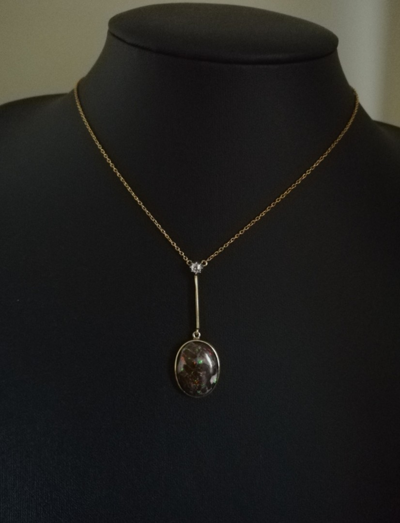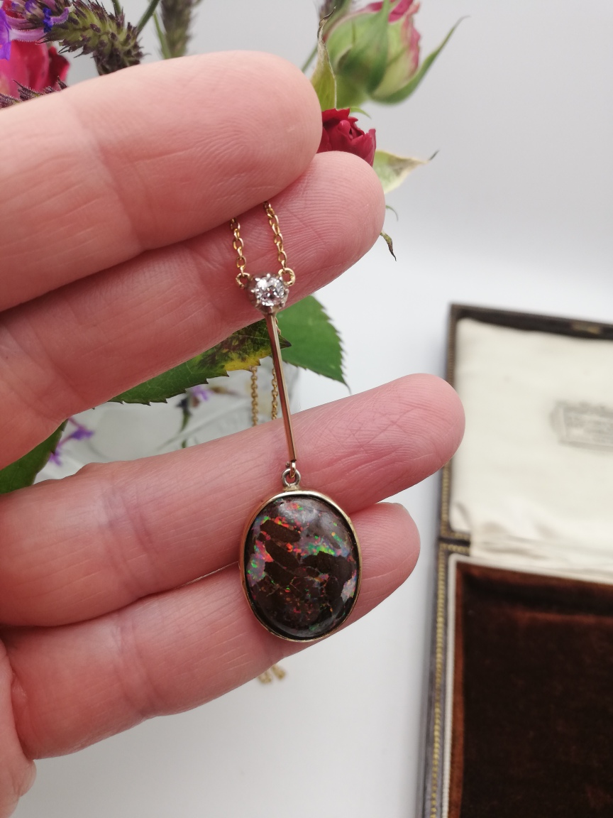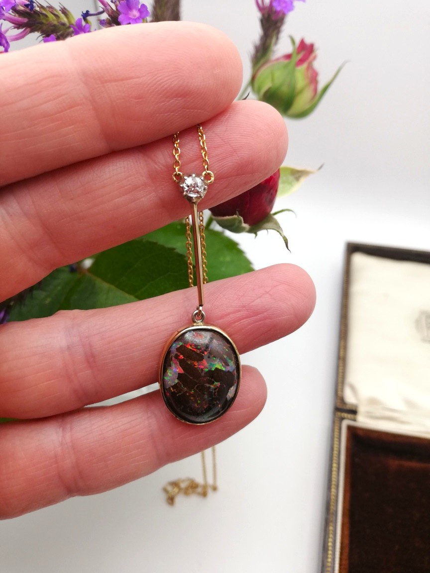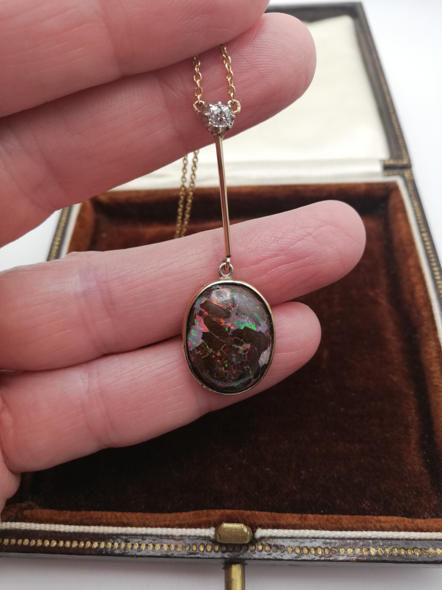 A very rare find indeed for a number of reasons, not least because of the gorgeously vibrant boulder opal used as the centrepiece to this classic c1910 Edwardian lavalier design. The stone is WOW and to find it paired with an old-cut diamond, set in a pinched setting (in Georgian style), well it is a beautiful rarity and I am pretty sure you will not find another just like it.