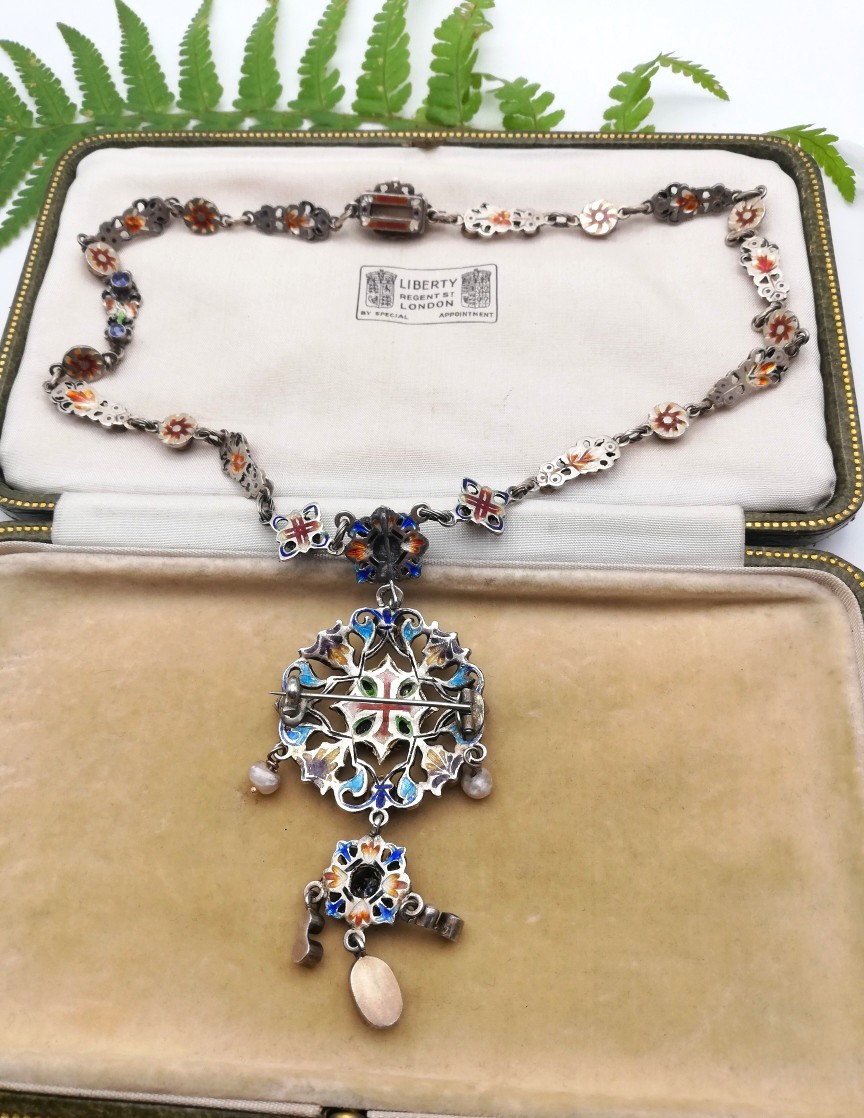 A swoon-worthy and stately Austro Hungarian necklace in silver gilt, c1880 which was created in Vienna, by the master silversmith, considered one of Europe’s finest jewellers and enamellers in the era- Hermann Böhm. His work is highly collectable and we usually see his large enamelled jars and vases, so finding his signed jewellery is always a treat! Böhm is considered as one of the finest enamellers of this type of enamelled Austro-Hungarian work. He enamelled designs to the verso of his work so you really can start to understand the amount of time taken to create one of his jewellery masterpieces. This piece is wonderfully designed so that the main pendant section can be detached easily from the chain and worn as a brooch. Two pieces of jewellery in one!