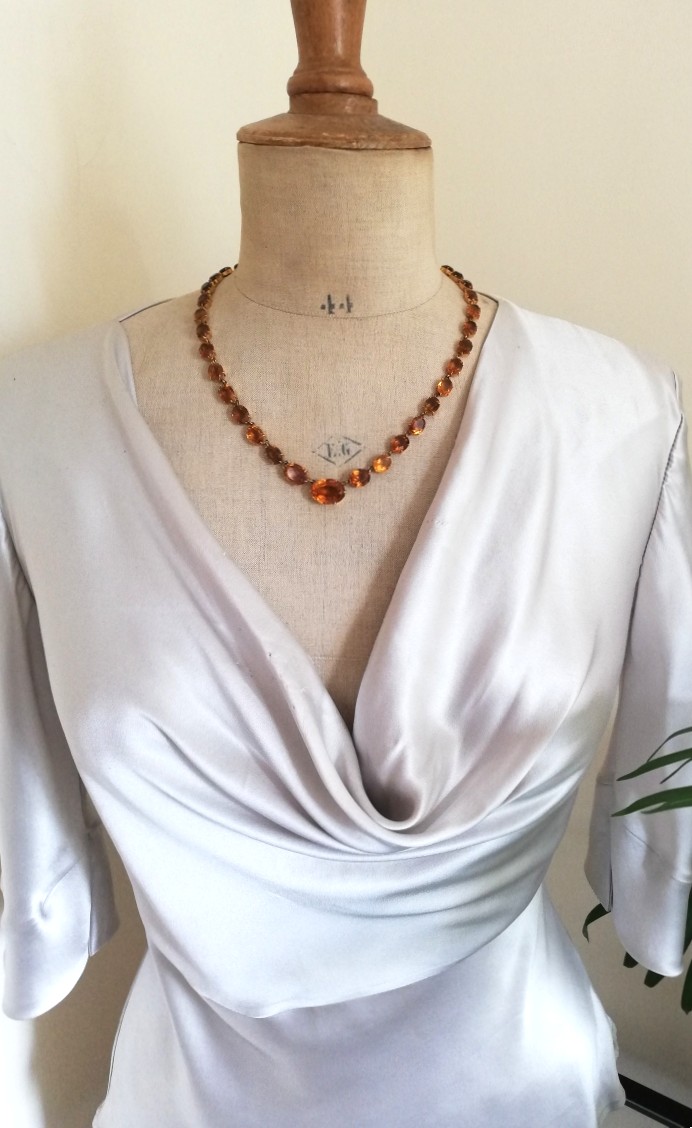 It is a fine piece of jewellery, stuffed full of claw -set faceted citrines of wonderful matching colour-looking sublime with the buttery settings. An Edwardian piece and one of the finest examples I have ever come across. Graduated in nature, there are 40 citrines in total, all cut and matched exquisitely. The central stone is large and attached to the chain at the top of the setting so it becomes more of a feature in the display. The citrine set box clasp is stunning…..citrines all the way around the necklace – what a dream. There is a 9ct gold Edwardian safety chain still attached and that gives you added security when wearing this stunning thing.