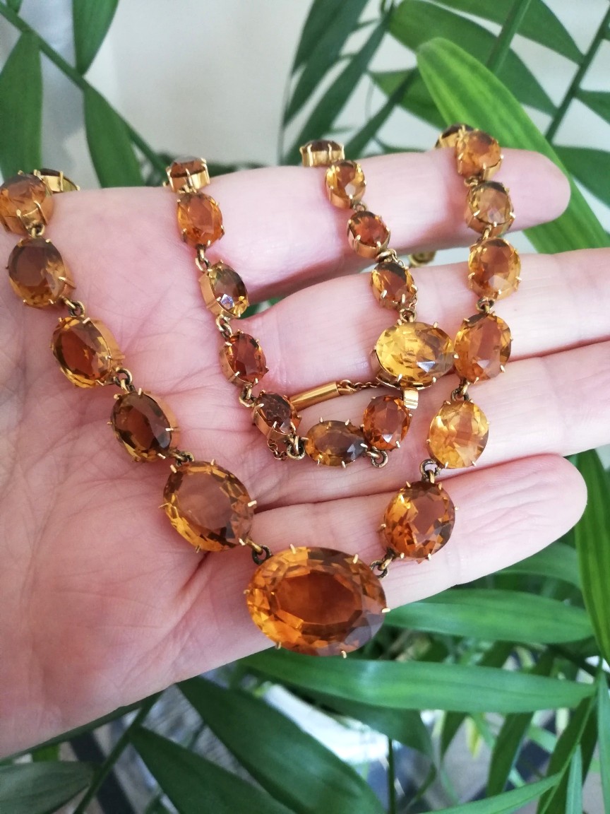 The largest citrine measures approx 18mm across and the smallest, approx 6mm. The length of the necklace is approx 50.5cm (approx 19.75 inches). In outstanding condition for an important antique jewel and no damage to the stones. She has been well cared-for.