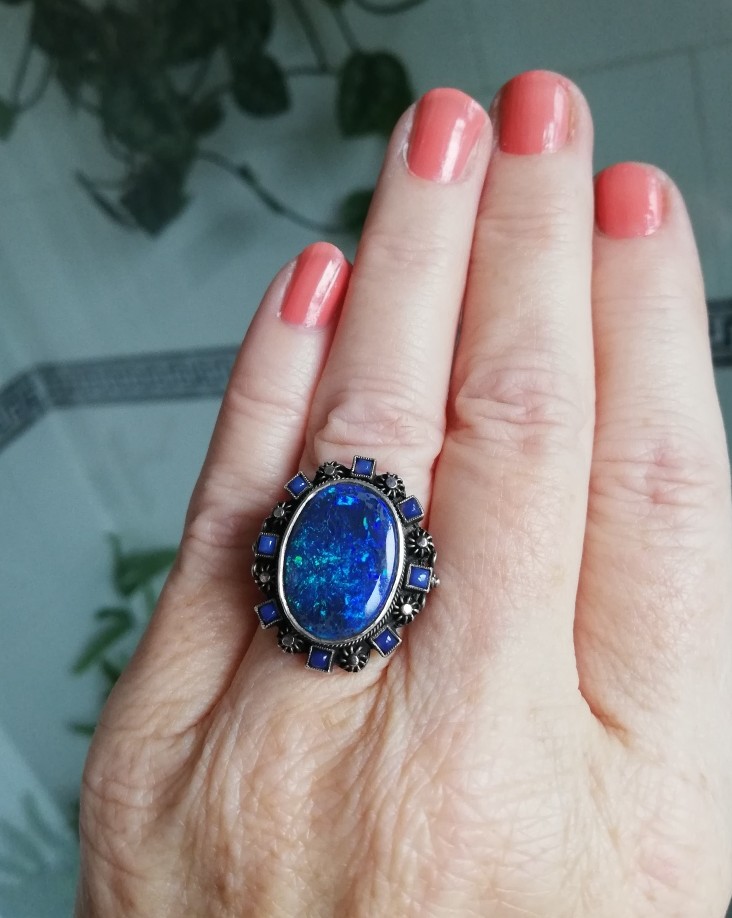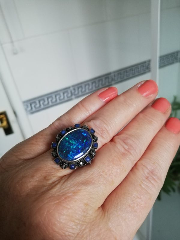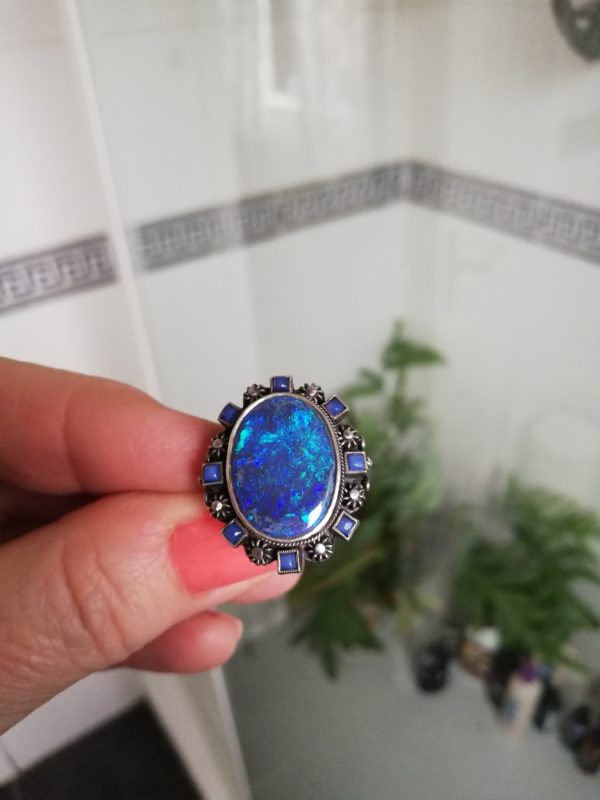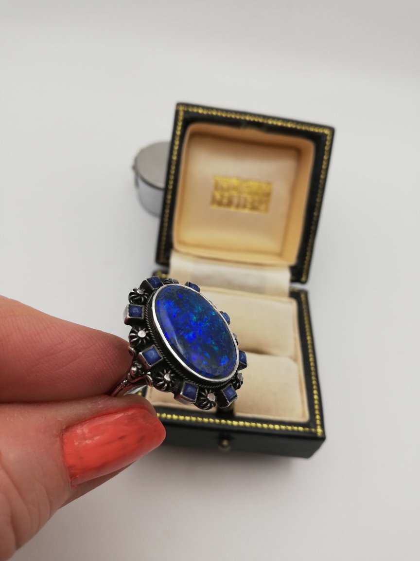 This ring oozes the designs of Sibyl Dunlop, not only in her sublime choice of accompanying stones, but also in the way she has used contradictory shapes of stones. The large black opal is bezel-set with a tiny ropework bead detail at the base of the setting. There is a surrounding oval halo, with 8 square bezel-set blue chalcedonies. In between each chalcedony there is a silver representational motif of a flower. The blue chalcedonies elevate the whole design, as they stabilise the design in a lighter mid blue halo. The colour shifts as the ring moves are sublime.