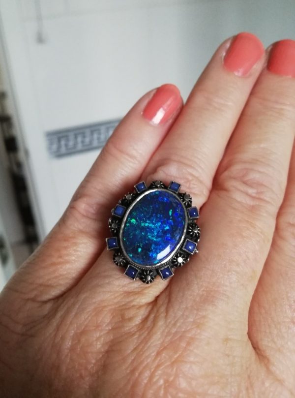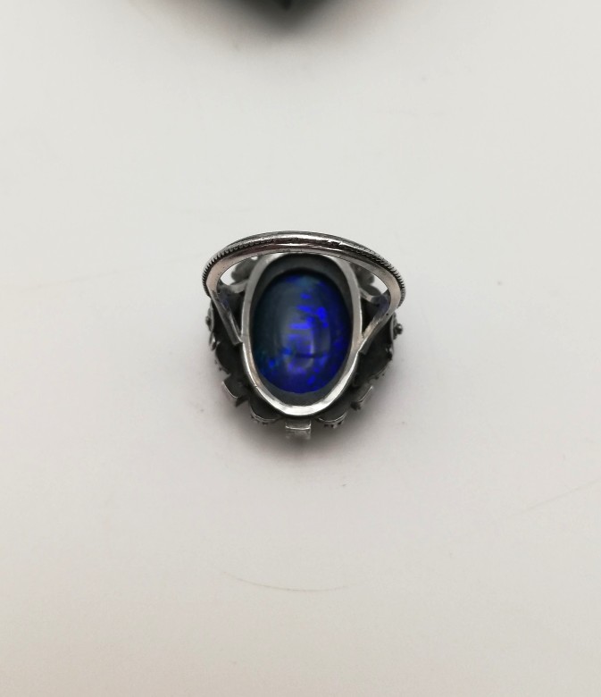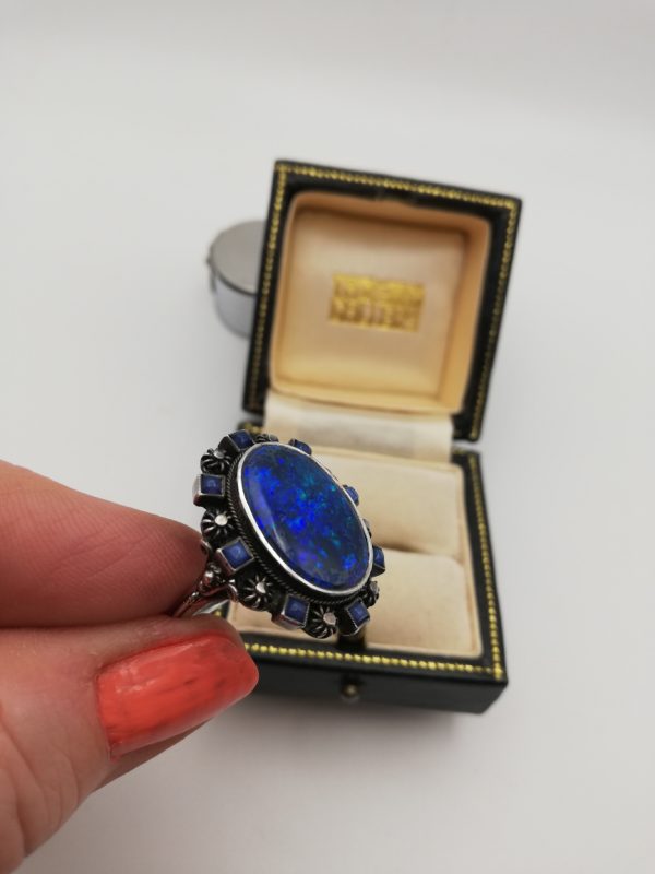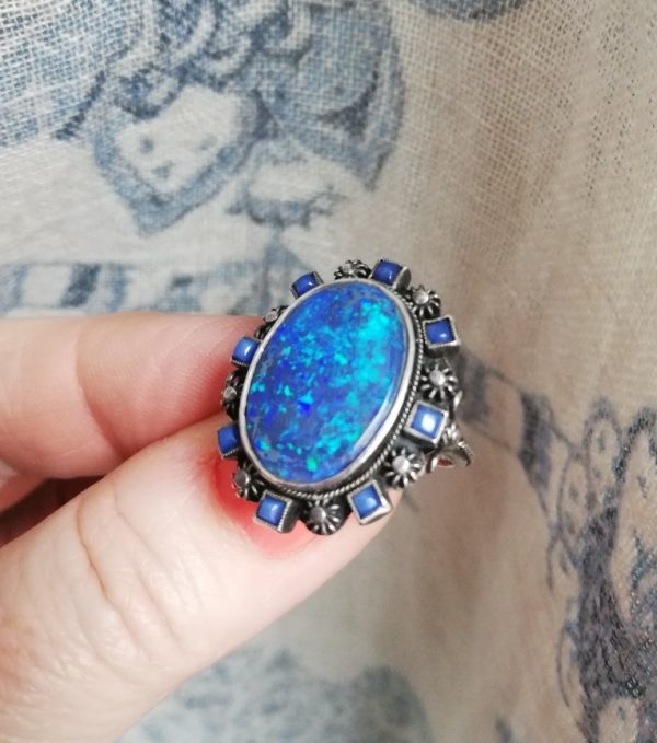 A unique and important Sibyl Dunlop Arts and Crafts ring dating from the c1925 era and featuring the most wonderfully lively black opal cabochon. It is a statement piece of British jewellery history by a hugely respected and sought-after designer, which would be at home in any museum collection. The large cabochon of black opal has a midnight blue base with lots of vivid turquoise and electric green flashes as you move the ring. Such an impressive stone, at approx 17mm by 12.5mm. A quality Sibyl Dunlop ring is so very hard to come by nowadays. The ring was originally sold by the wonderful Tadema Gallery in London in 1989, for what equates in today’s money to £4,800.00. I have the original sales receipt.