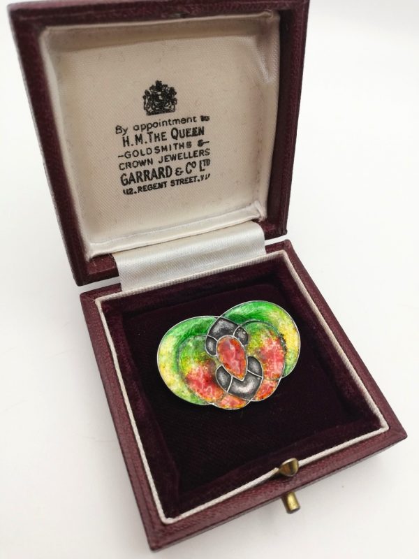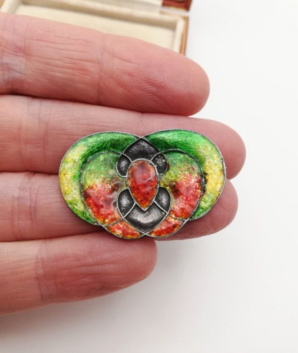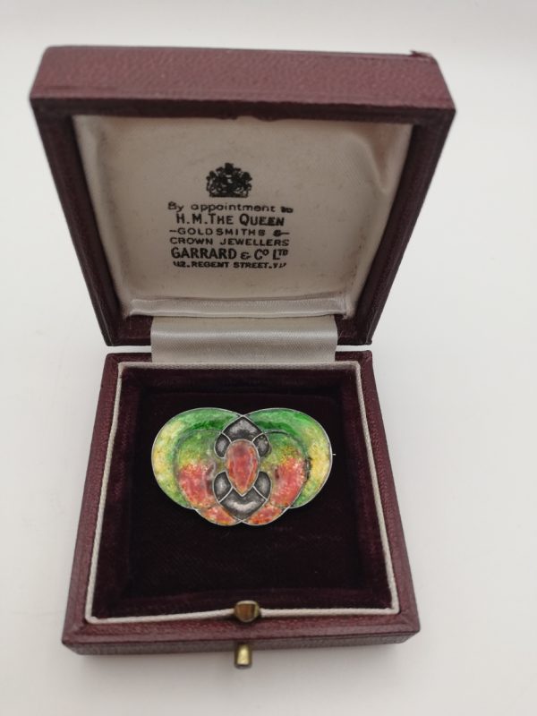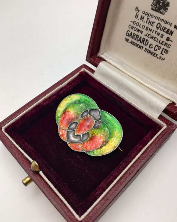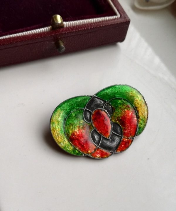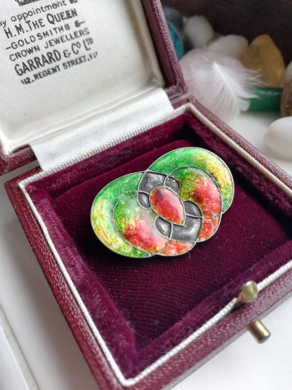 A standout Murrle Bennett c1905 brooch, designed by the wonderful Jessie Marion King (one of the Glasgow Girls). Jessie King’s work is hugely sought-after and with this design and striking colourway, you can see why her work is so beautiful.