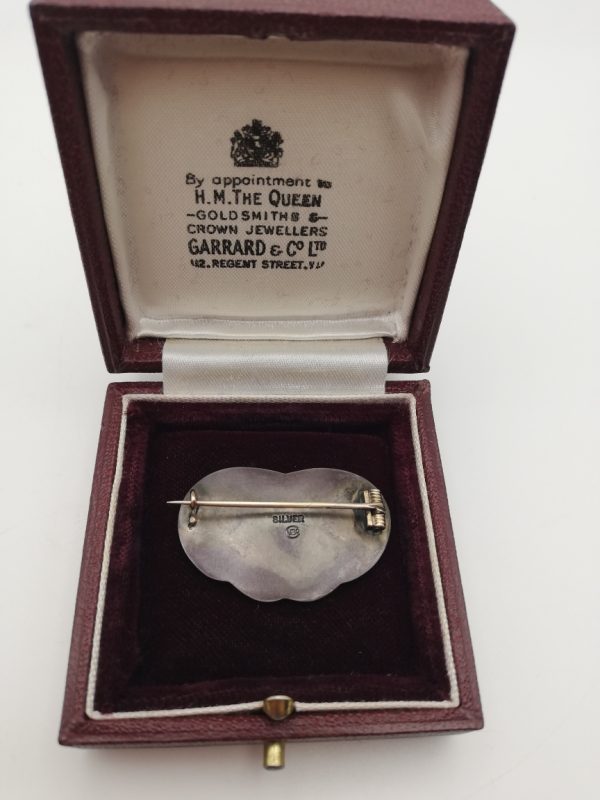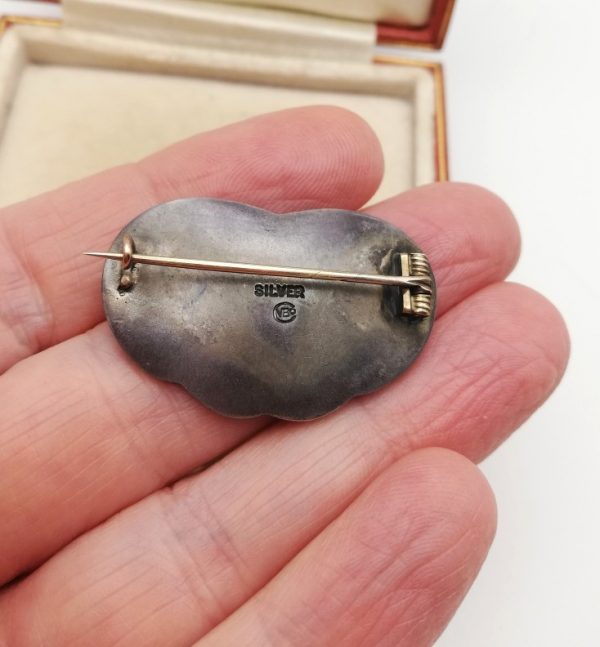 The brooch is stamped to the verso with “SILVER” and with the Murrle Bennett maker’s mark clearly impressed beneath it. There are hand etched jeweller’s numbers that I spotted under the loupe. It looks like the serial number / design number “438-31” and below it “E/c”.