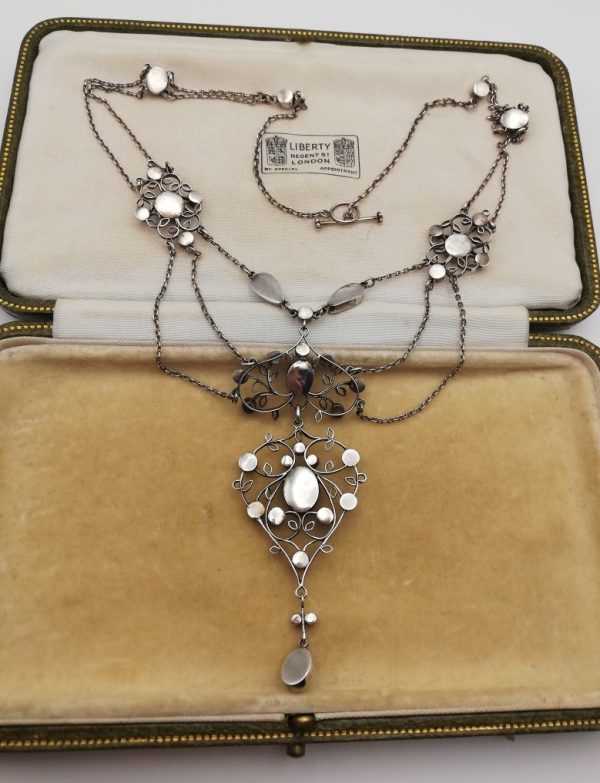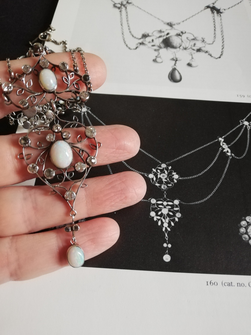 This superlative necklace is exciting on so many levels, not least because of its form. It remains in original condition, right down to the chains and even the fabulous toggle fastener that is formed into flowers on each end. The use of opal and rock crystal, such upliftingly lights stones, is in harmony with the way the leaves are formed by a mere outline of silver – this is such an ethereal and dreamy piece of work. A similar design by the Gaskins is documented on page 430  of Julius Hoffmann Jr’s book ” Der Moderne Stil”. I will attach a photo of another similar necklace shown on p78 “Arthur and Georgie Gaskin” exhibition catalogue by Birmingham Museums and Art Gallery.