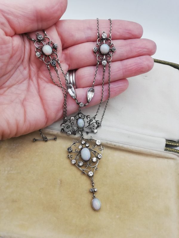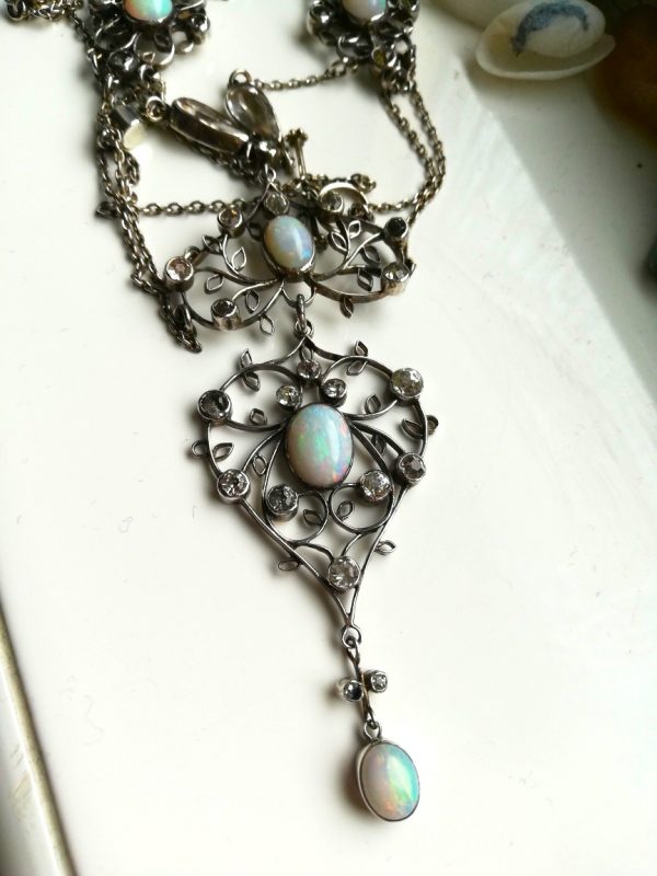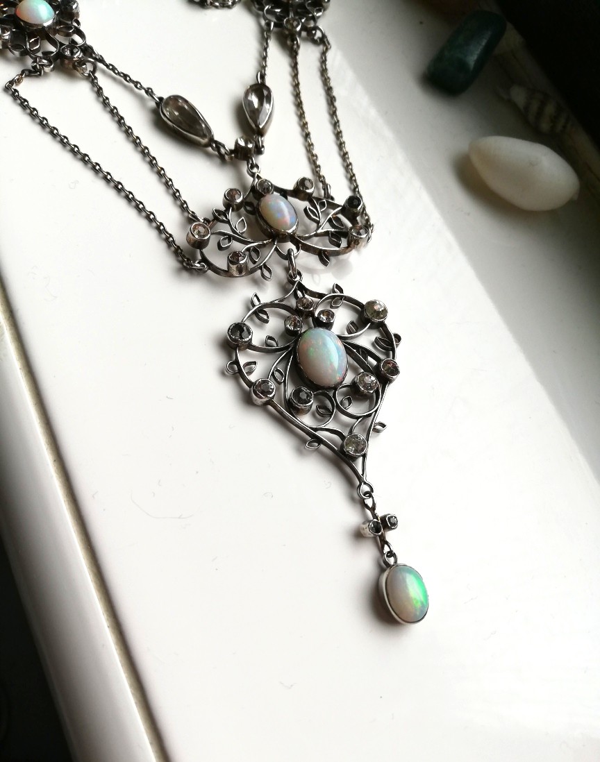 Suspended below that is the heart-shaped main plaque, again set with a lively opal and an arrangement of rock crystal stones glistening and catching the light around it. The openwork is beautiful and the lightness of the leaves’ structure elevates this jewel even further. There is an elegant drop suspended below, with a further opal and two tiny faceted rock crystals. The balance and beauty of this necklace is really second-to-none.