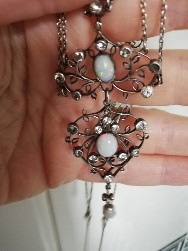 The main pendant section is formed in four parts. At the top we have a small central faceted rock crystal, flanked on either side by an elongated, opal  “wing” of faceted rock crystal. Suspended below is the first of two plaques. With a lively opal in the centre of the design and an arrangement of rock crystal stones set among the openwork foliate design-it is truly a harmonious design.