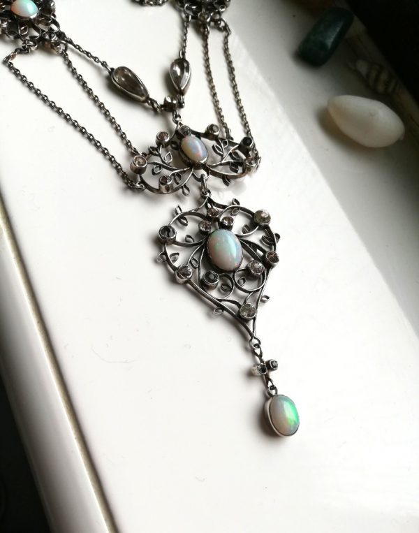 Sumptuous festoon chains which lead from three parallel chains, to two and then to one chain as the necklace leads to the clasp. There are two station plaques, also set with an opal and rock crystals, plus an opal set station on each side further up the necklace and finally, a singular rock crystal. Astonishing to consider the amount of thought and hours of work that has gone into this c1905 creation. Even the tiniest of details has been crafted exceptionally, such as the flower-like forma on each end of the toggle. A complete work of art and a treasure that would be at home in any museum around the world