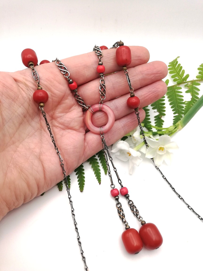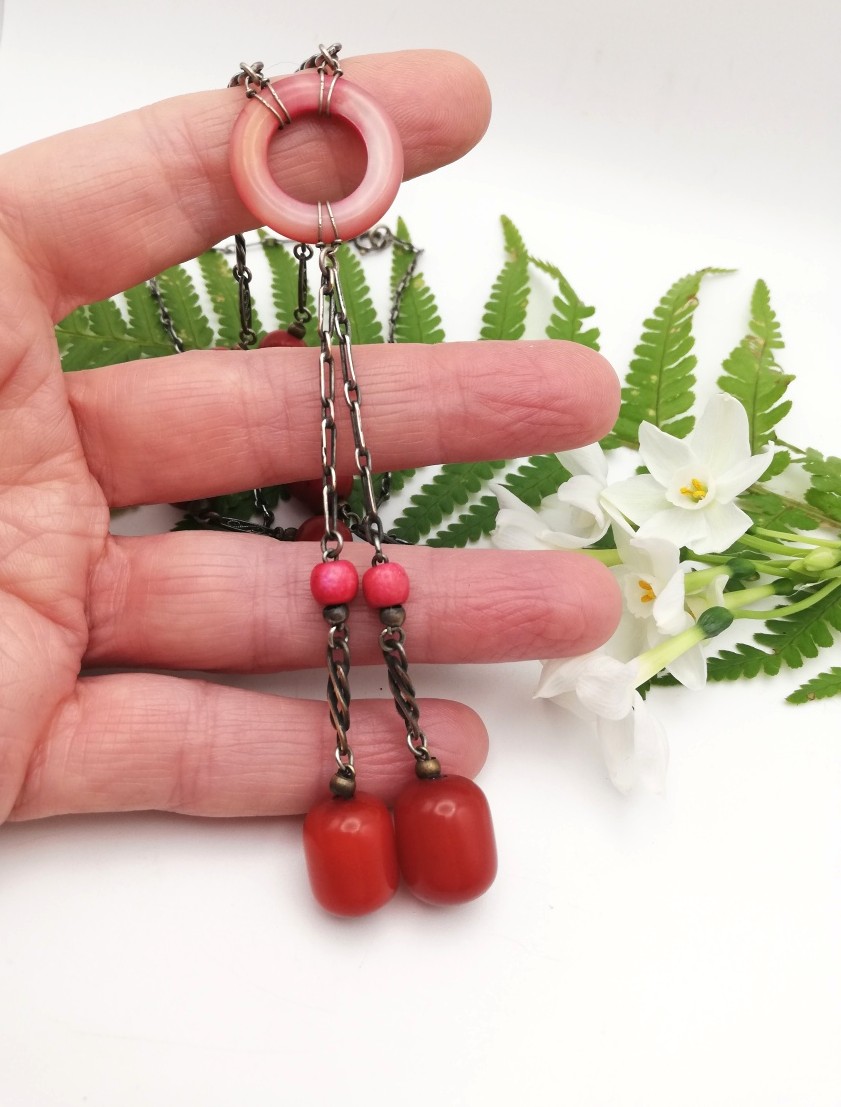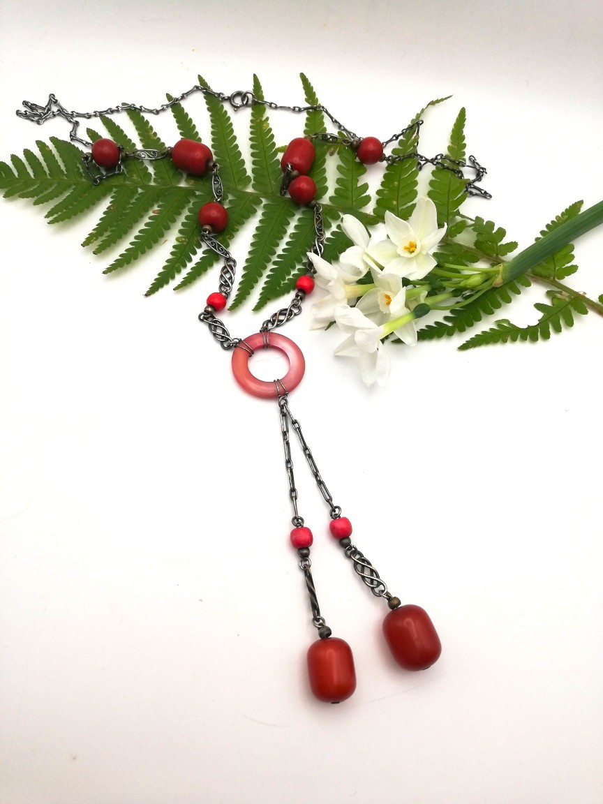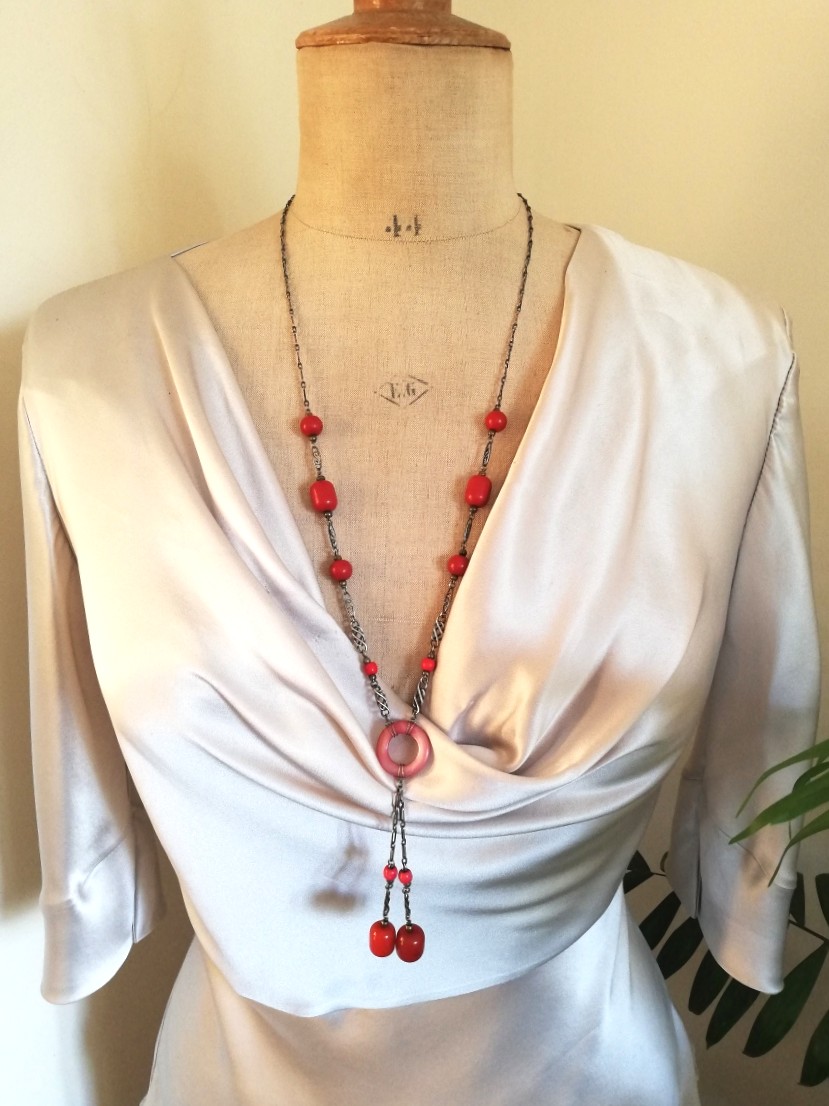 Each vibrant red Bakelite bead, both round beads and barrel-shaped beads, has been integrated into a silver chain, with two different types of silver links. I love the way the central Bakelite disc has been tied into the chain and what is rather unusual, is the fact that there is a Toi et Moi feature suspended from that central disc. It hands beautifully when the necklace is worn.