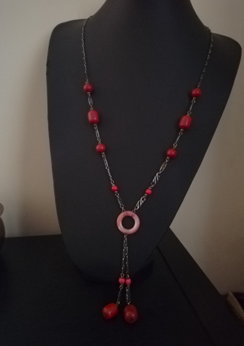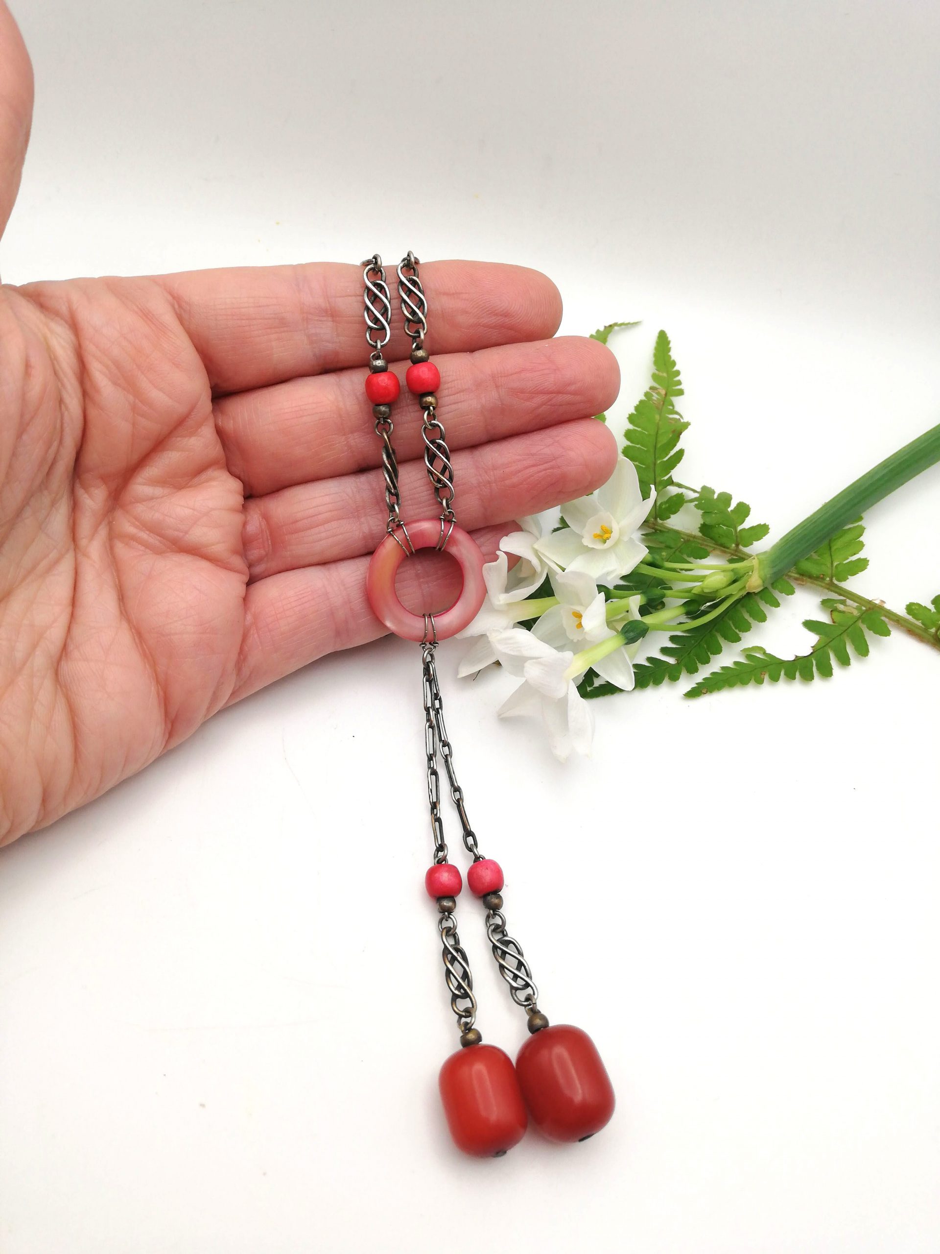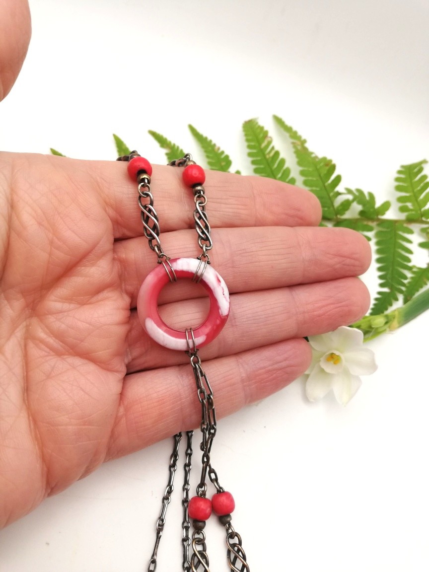 Each vibrant red Bakelite bead, both round beads and barrel-shaped beads, has been integrated into a silver chain, with two different types of silver links. I love the way the central Bakelite disc has been tied into the chain and what is rather unusual, is the fact that there is a Toi et Moi feature suspended from that central disc. It hands beautifully when the necklace is worn.