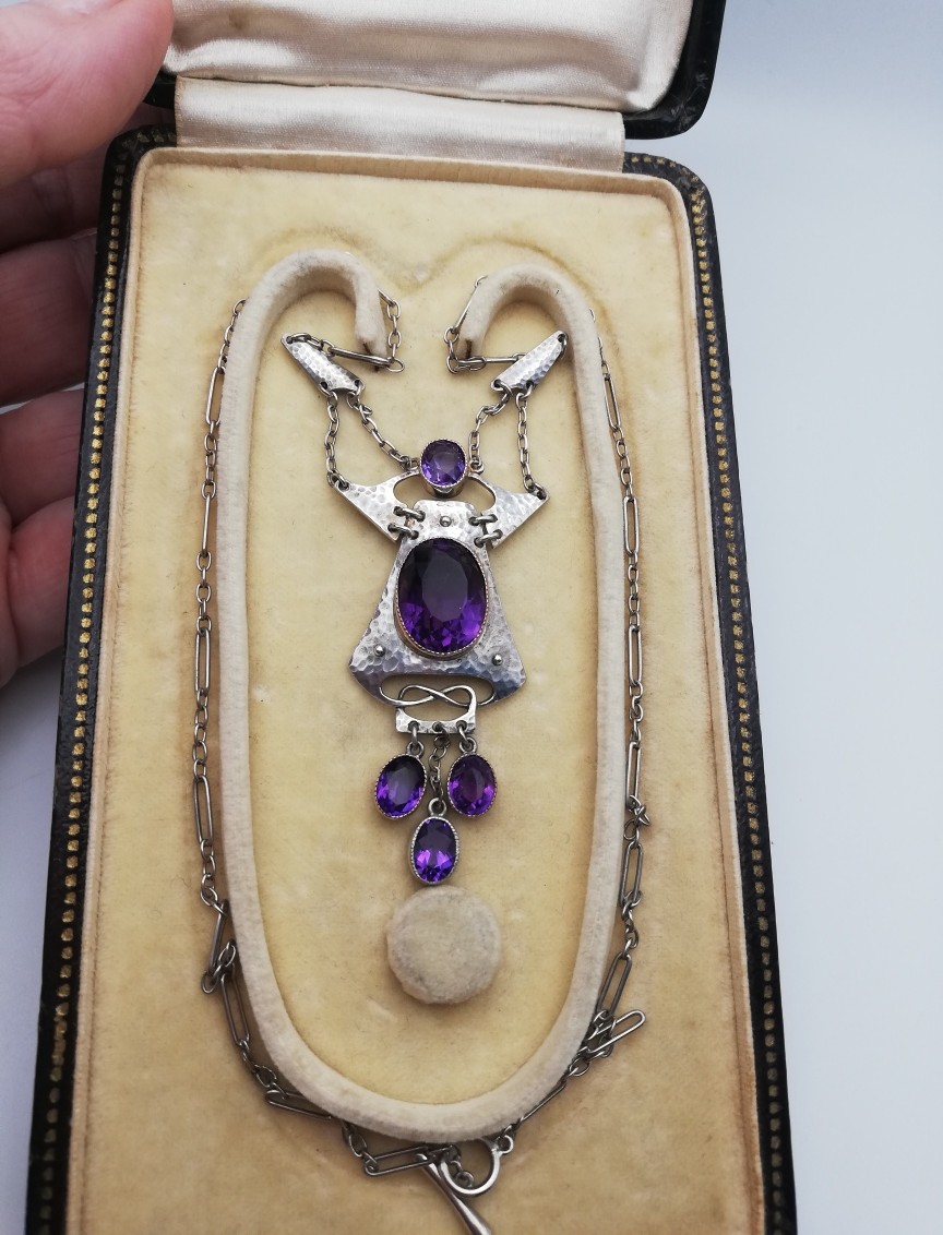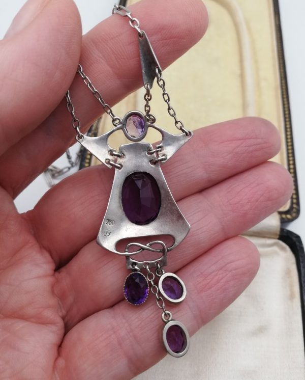 A superlative example of the glorious Art Nouveau / Arts and Crafts necklaces c1900 created by Murrle Bennett, the Anglo German company, who mainly sold through Liberty & Co of London. This is a rare design I have not seen before, and is completely intact. In original condition, tick- stones all perfect and stunningly vibrant (Siberian amethysts), tick – original chains, tick – original toggle fastener, tick – gold mounts to the amethysts, tick – fully signed as Murrle Bennett piece with clear MBc and 950 stamps, tick and finally, a superlative and intricate design, tick. Undoubtedly, a c1900 museum-worthy MB necklace.