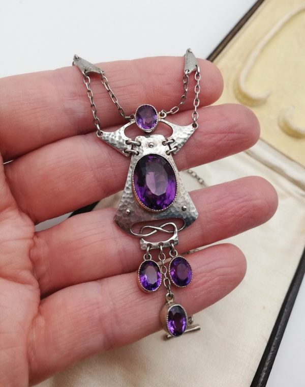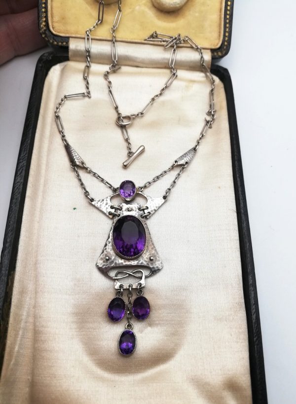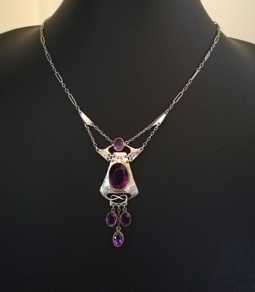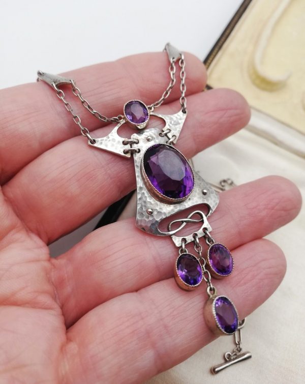 This fabulous necklace has all of the features you would hope to find in one of these early 1900s pieces, with its hammered silver panels, faux rivets, separate panels held together by double links, matching spacers along the chain, gold mounts to create the perfect foil for the vibrancy of the Cadbury’s purple amethysts, an Art Nouveau knotted motif, fetter chain and so on. This incredible necklace is elevated further by the use of these five intense and rich Siberian amethysts, which are incredibly intense in colour. Just beautiful!