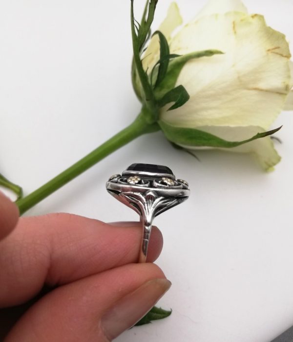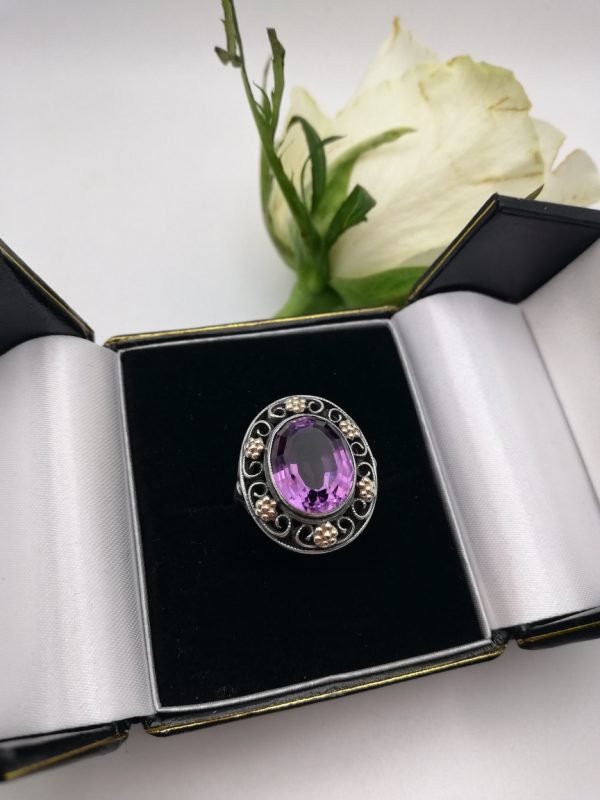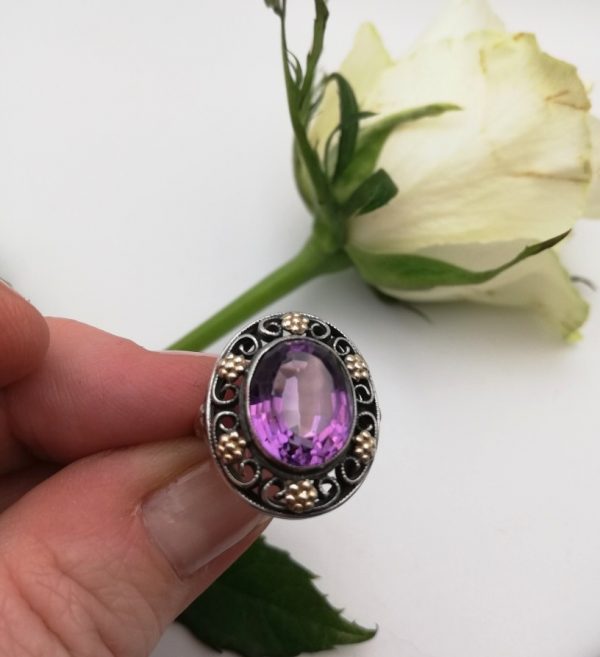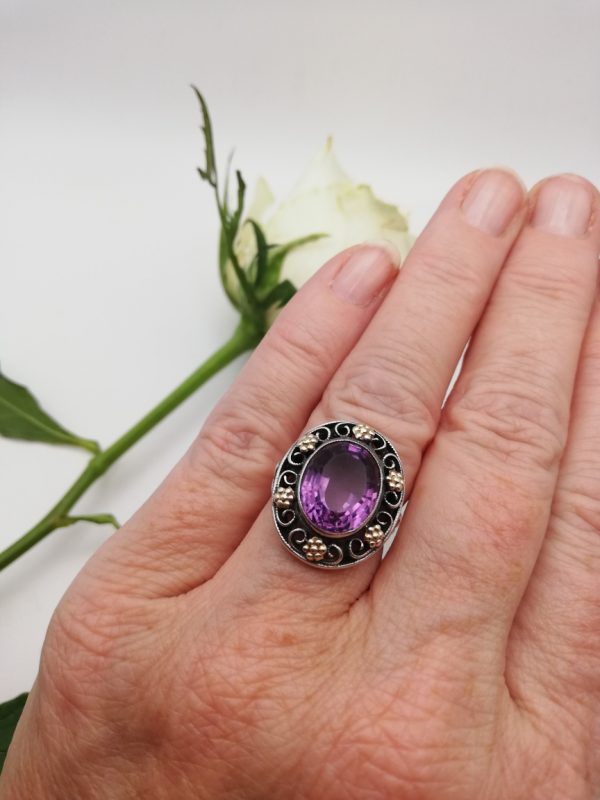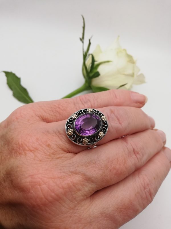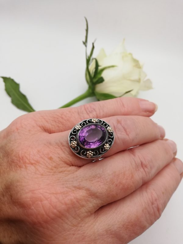 The large, faceted amethyst is a beauty, as you can see, it is oval emerald cut, showing those beautiful stepped lines one associates with emerald cut stones. It throws the light around superbly. The silver coils and overlaid gold forget-me-nots design was perhaps the first motif Bernard incorporated into his jewellery in the 1920s. This is a rare ring and a wonderfully statement example of Bernard’s hand wrought earlier work.