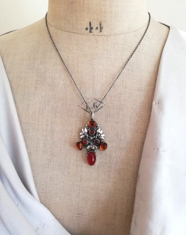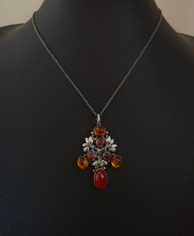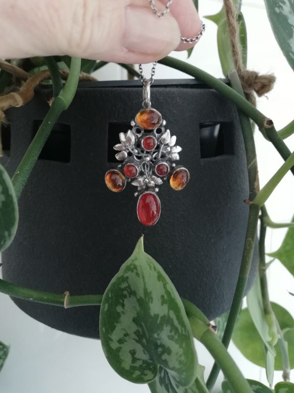 An openwork design is set with sprays of leaves and punctuated by tiny silver berries. The work, as you can see is fine and precise. Three small carnelians are bezel set to the centre with the largest carnelian set vertically at the base of the pendant. Three bezel-set citrines are also set into the design ensuring there is a wealth of richness of colour- a very autumnal piece actually, in its yellows and oranges.