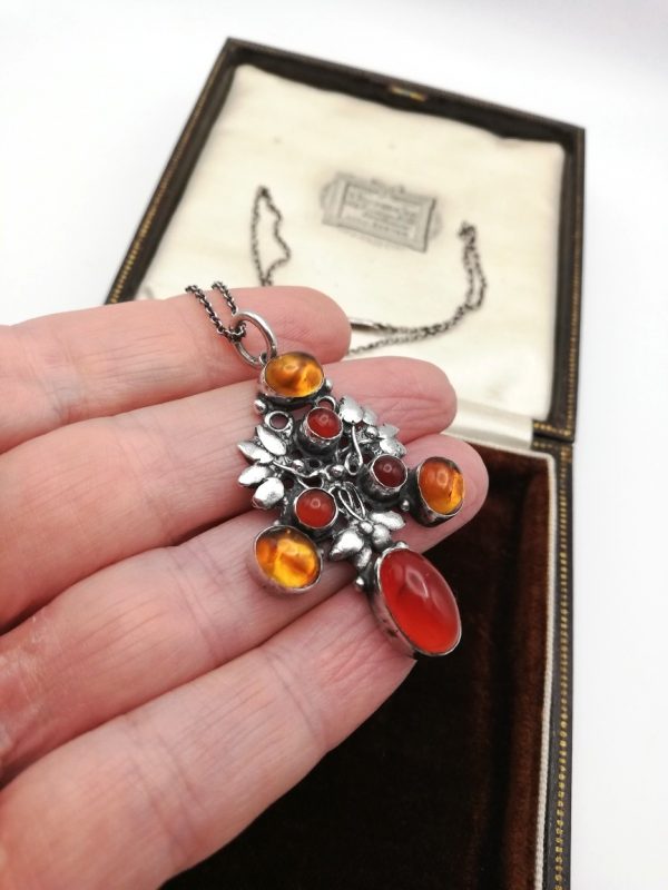An eye-catching beauty of a piece from England c1900, all crafted by hand and set with bright citrines and carnelians. The foliate work on this unique Arts and Crafts piece really is so dense and if you flip the pendant over you can see the astonishing work that has actually gone into making this gorgeous pendant.