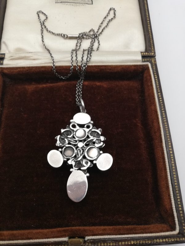 I have lightly polished the front of the pendant, although there is still patina to the piece which you may prefer to polish further. The stones are all closed-backed so please avoid using liquids. The barrel fastener sterling chain is antique. The only point worth noting is that the bale has obviously been replaced at sometime in her history. A lovely, vivid piece of hand-wrought work which is a unique piece of art.