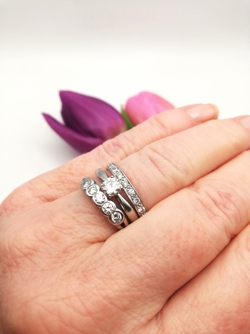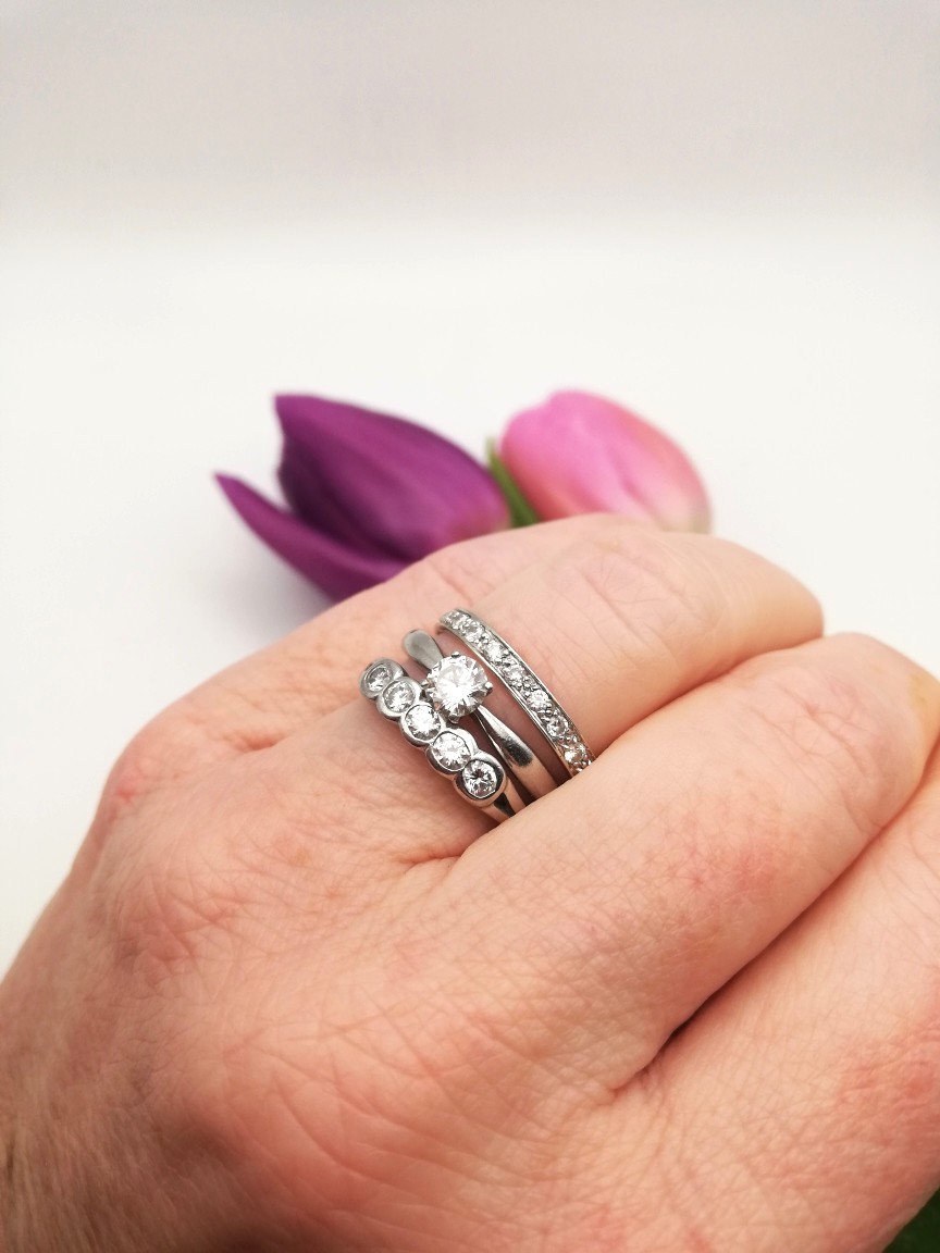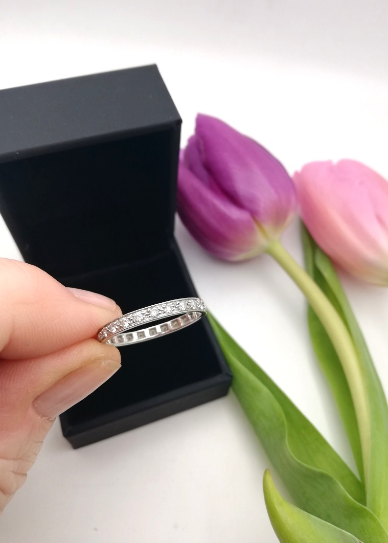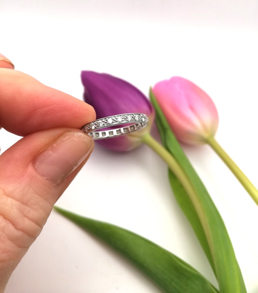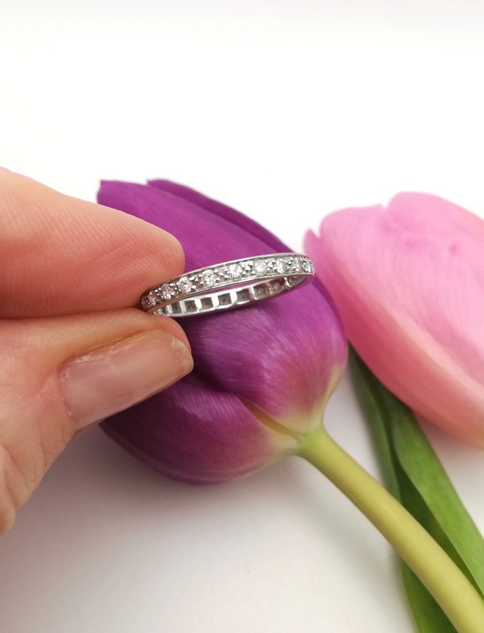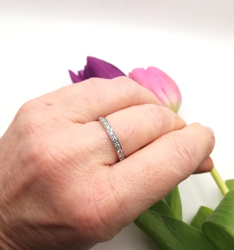 A vintage full eternity ring with diamonds set in 18ct white gold. Unusually the ring is stamped as 18ct -they were not usually stamped because of the relatively little space on the inside of the band for the mark. Such a useful and significant type of ring, as these eternity rings can be gifted and worn as a love token, alongside a wedding ring or else can be used as part of a stacking arrangement. Please note that it is the slim all-diamond ring at the top of the the three rings in the photos, where I have demonstrated a stacking arrangement.
