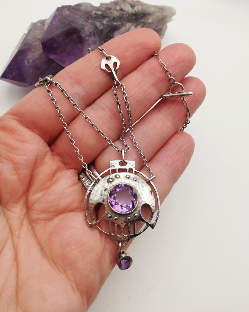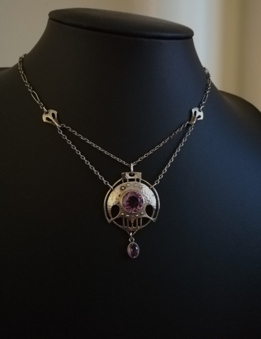 It is a pleasing example of one of MB’s hammered silver Art Nouveau designs, complete with matching spacers, also hand hammered. I love the Jugendstil touches with the parallel vertical lines that cut through the circular section. The main section is also decorated with the faux rivet features we love to see on these fabulous MB necklaces. The cut-outs, both on the main pendant and also on the spacers, enhance the design statement even further. I love that this is an all-original piece, right down to the original toggle fastener.