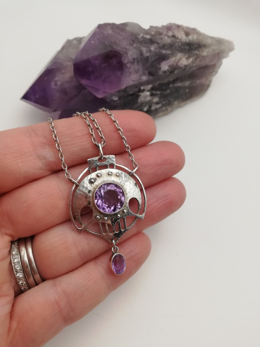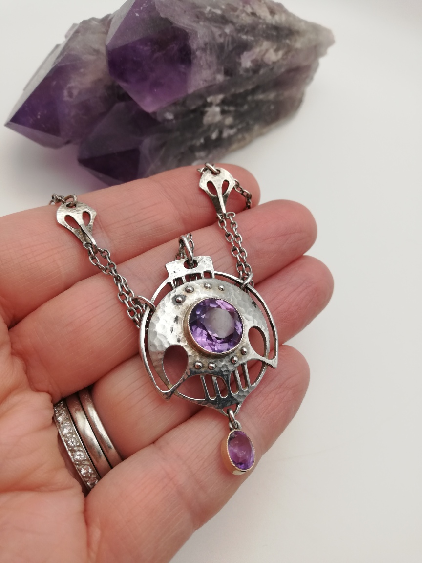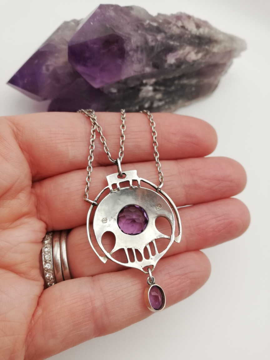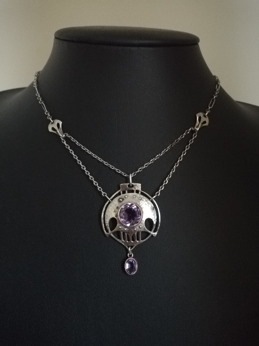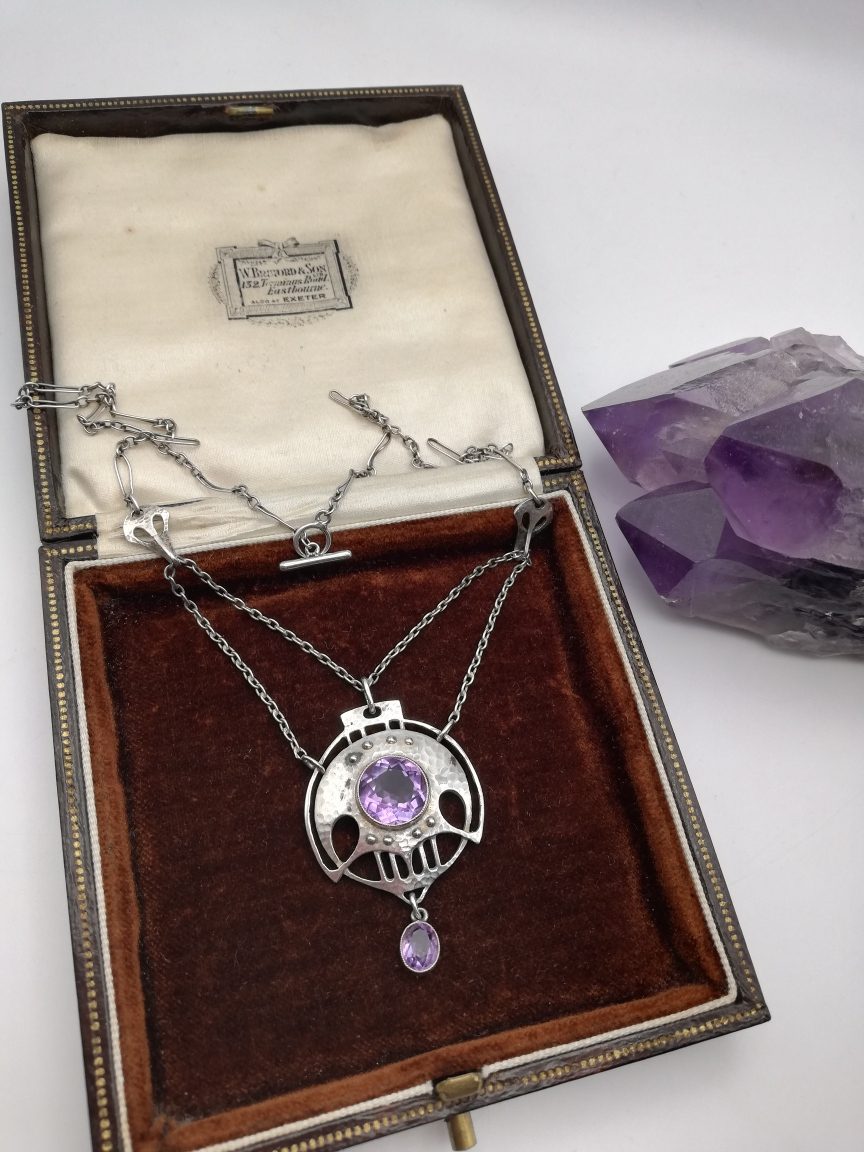 A lovely example of the fabulous Art Nouveau / Arts and Crafts necklaces c1900 created by Murrle Bennett, the Anglo German company, who mainly sold through Liberty & Co of London. This is a beautiful necklace, in super condition and all original. The chains are original and the pendant is fully signed to the verso, as you would hope, with “950” for the quality of silver (higher than sterling) and also with the Murrle Bennett maker’s mark in a circle.